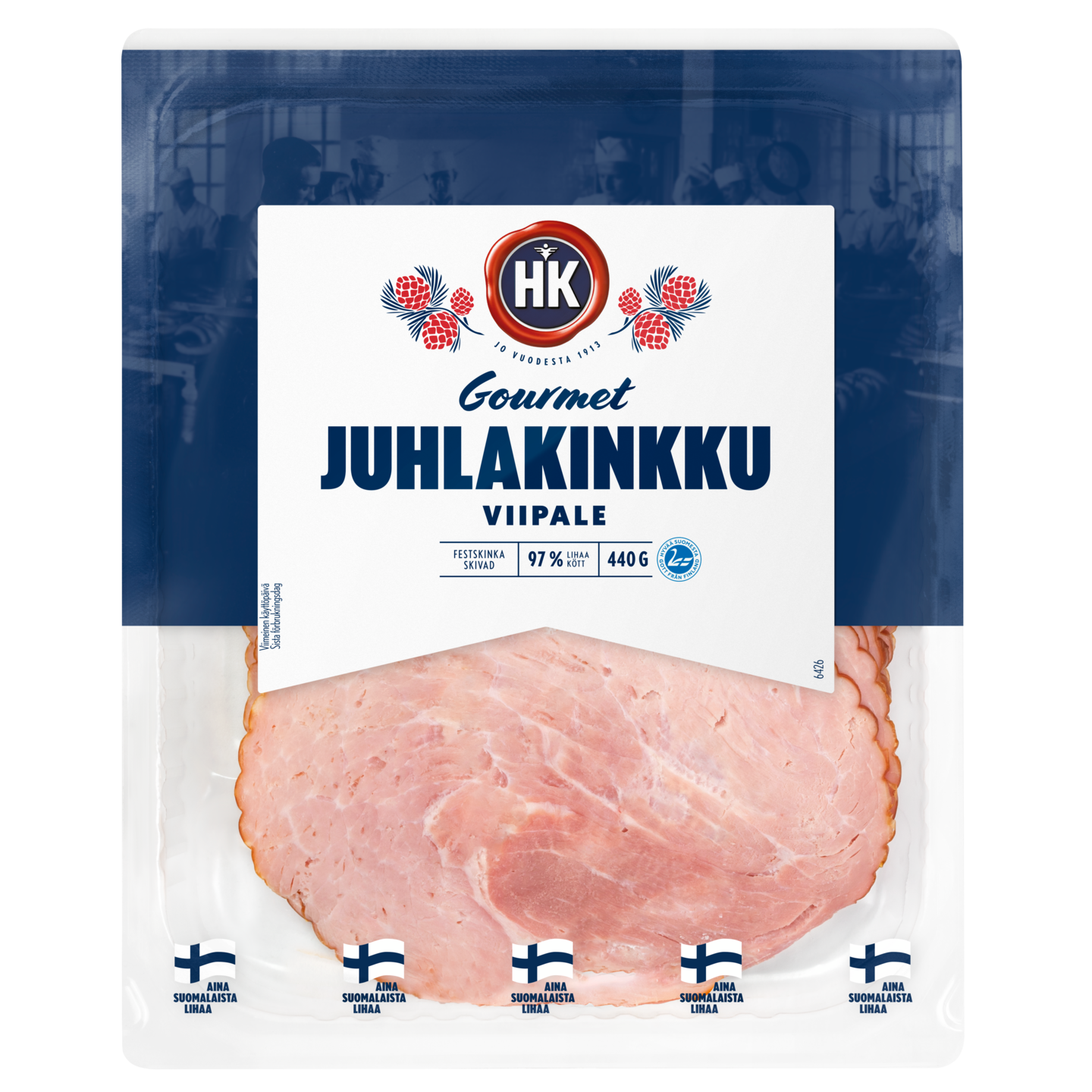 HK Gourmet Juhlakinkku on laadukas ja herkullinen suomalaisesta lihasta valmistettu joulukinkku hieman paksumpina siivuina kuin leikkeleissä, jolloin se toimii niin leivänpäällisenä kuin osana ateriaakin. Kinkun herkullinen maku viimeistellään savustamalla aidolla leppäsavulla. Juhlakinkun lihapitoisuus on 97 % eikä se sisällä lisättyä fosfaattia, jonka ansiosta kinkku on erityisen mehevä ja murea.