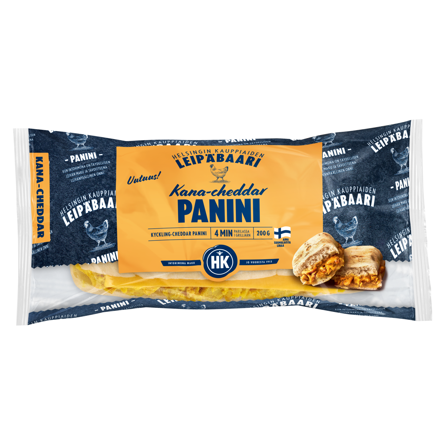 Helsingin Kauppiaiden Leipäbaarissa tunnetaan maukkaiden täytettyjen leipien salat. Kana-cheddar-paninissa maistuu tutut maut, paahdettu suomalainen kana, mehevä cheddar-juusto ja mieto currykastike. Lämmitä panini rapeaksi voileipägrillissä, uunissa tai airfryerissa ja nauti välipalana tai ateriana. Helsingin Kauppiaiden paninit valmistamme Suomessa. Lajittele pakkaus herkuttelun jälkeen muovina.
