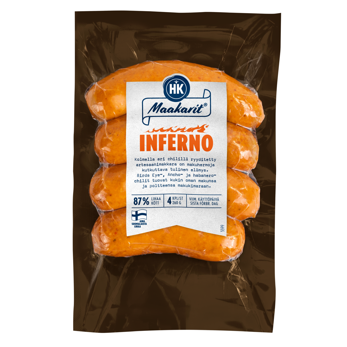 HK Maakarit® Inferno on tulisesta mausta pitävän unelmamakkara. Kolmella eri chilillä ryyditetty artesaanimakkara on makuhermoja kutkuttava elämys. Birds Eye-, ancho- ja habanero chilit tuovat kukin oman makunsa ja poltteensa makukimaraan. Grillauksen lisäksi tämä makkaraherkku sopii monipuolisesti erilaisiin mausteisiin ruokiin. HK Maakarit® -artesaanimakkarat valmistetaan Vantaan Pakkalassa perinteisiin kädentaitoihin luottaen, aina suomalaisesta lihasta. Lajittele pakkaus käytön jälkeen muovina.