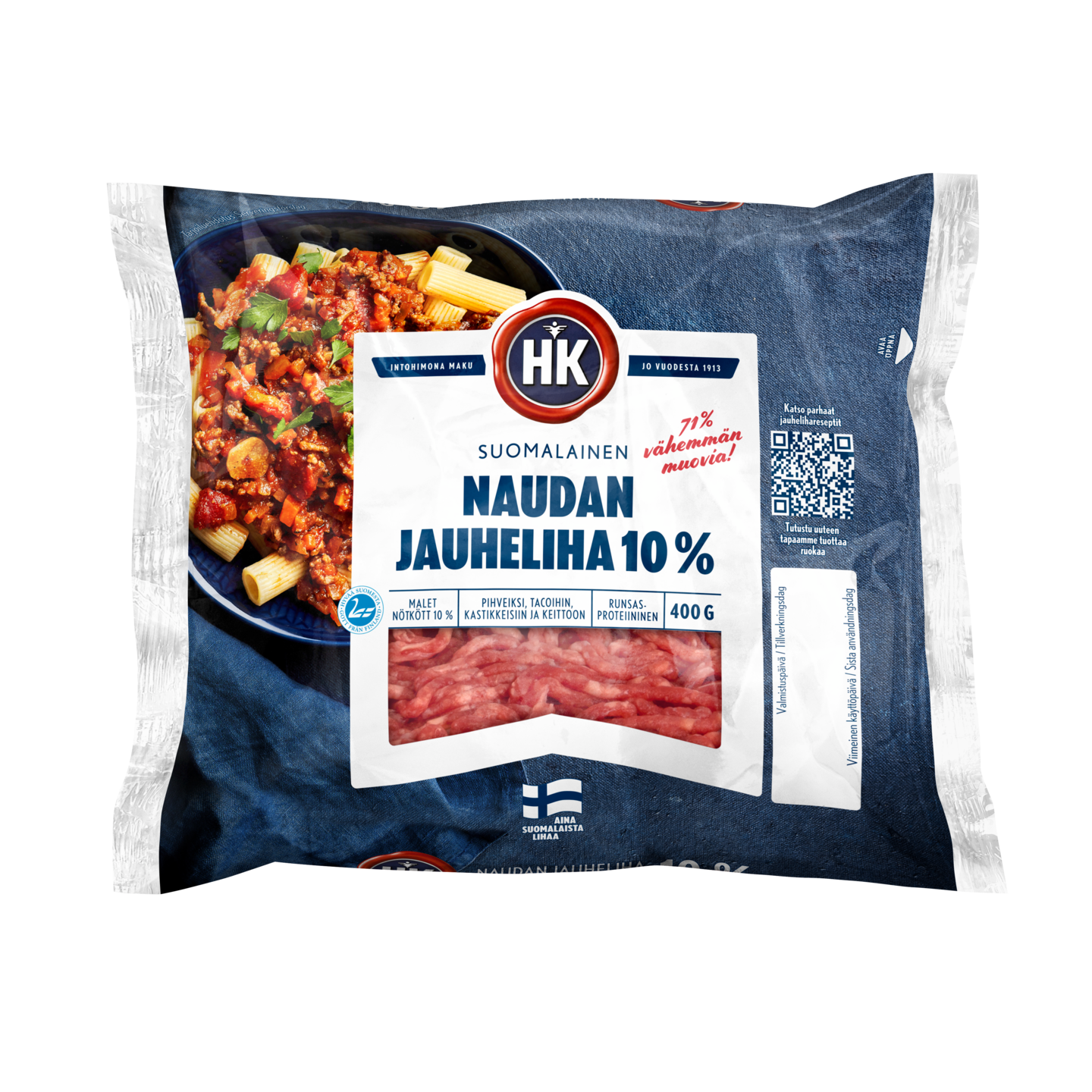 Vähärasvaisempi 10% suomalainen HK Naudan jauheliha sopii hyvin monenlaisiin jauheliharuokiin, kuten jauhelihakeittoon, jauhelihapihveihin, lihapulliin ja lasagneen. Nauti lihasta osana monipuolista ruokavaliota. Naudan jauheliha on luontaisesti hyvä B12-vitamiinin ja raudan lähde. Muovia säästävä pussipakkaus. Suomalaista naudanlihaa, joka on kasvatettu vastuullisesti kotitiloillamme. Lajittele pakkaus käytön jälkeen muovina.