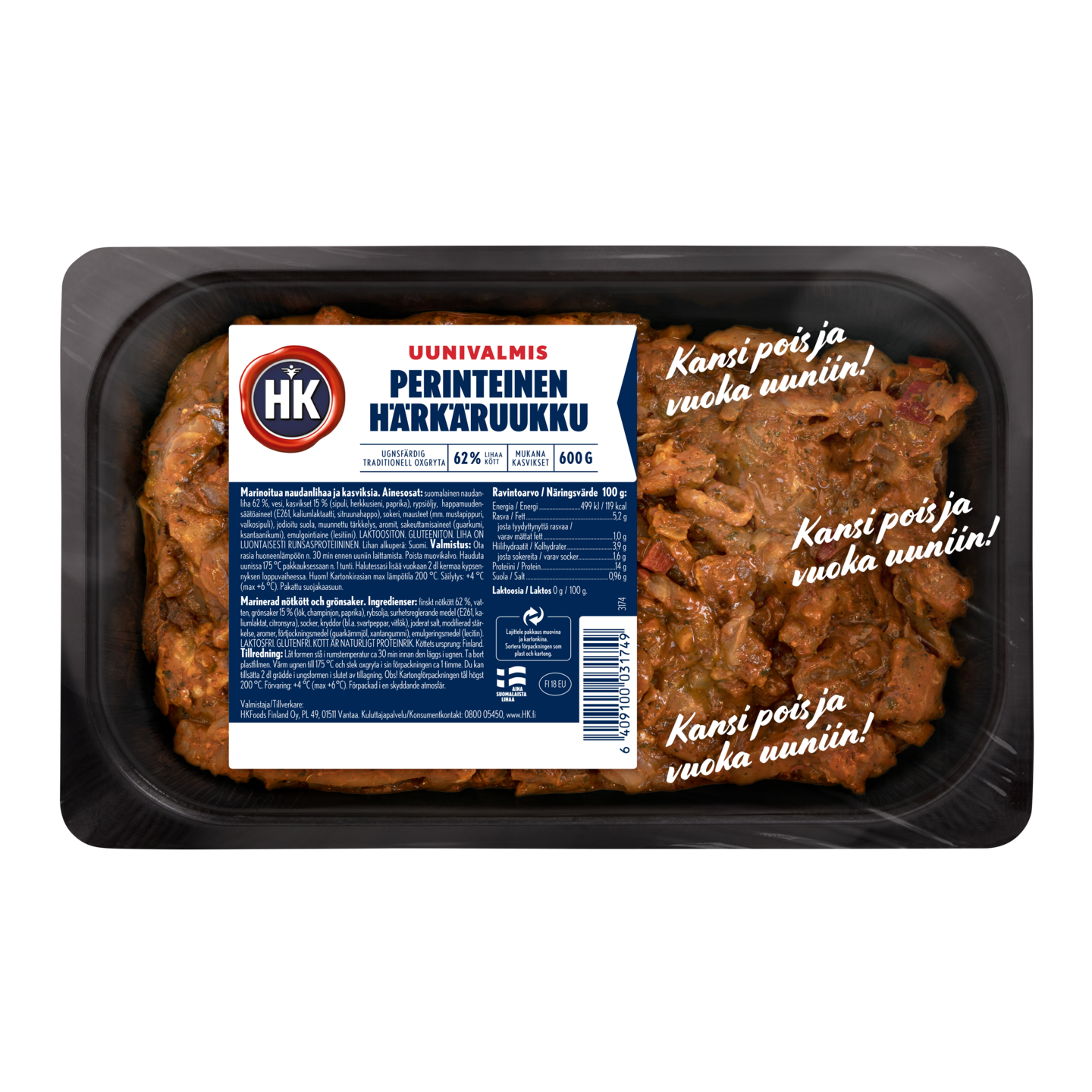 Kansi pois ja uuniin! Perinteinen täyteläisen makuinen härkäruukku naudan sisäpaistista uuninkestävässä kartonkivuoassa. Mukana herkkusieniä, paprikakuutioita ja paistettua sipulia. Valmistus on helppoa. Poista vain suljentakalvo ja laita vuoka uuniin. HK Perinteinen härkäruukku valmistetaan suomalaisesta naudanlihasta, joka on kasvatettu vastuullisesti kotitiloillamme. Lajittele pakkauksen suljentakalvo muovina ja vuoka kartonkina.