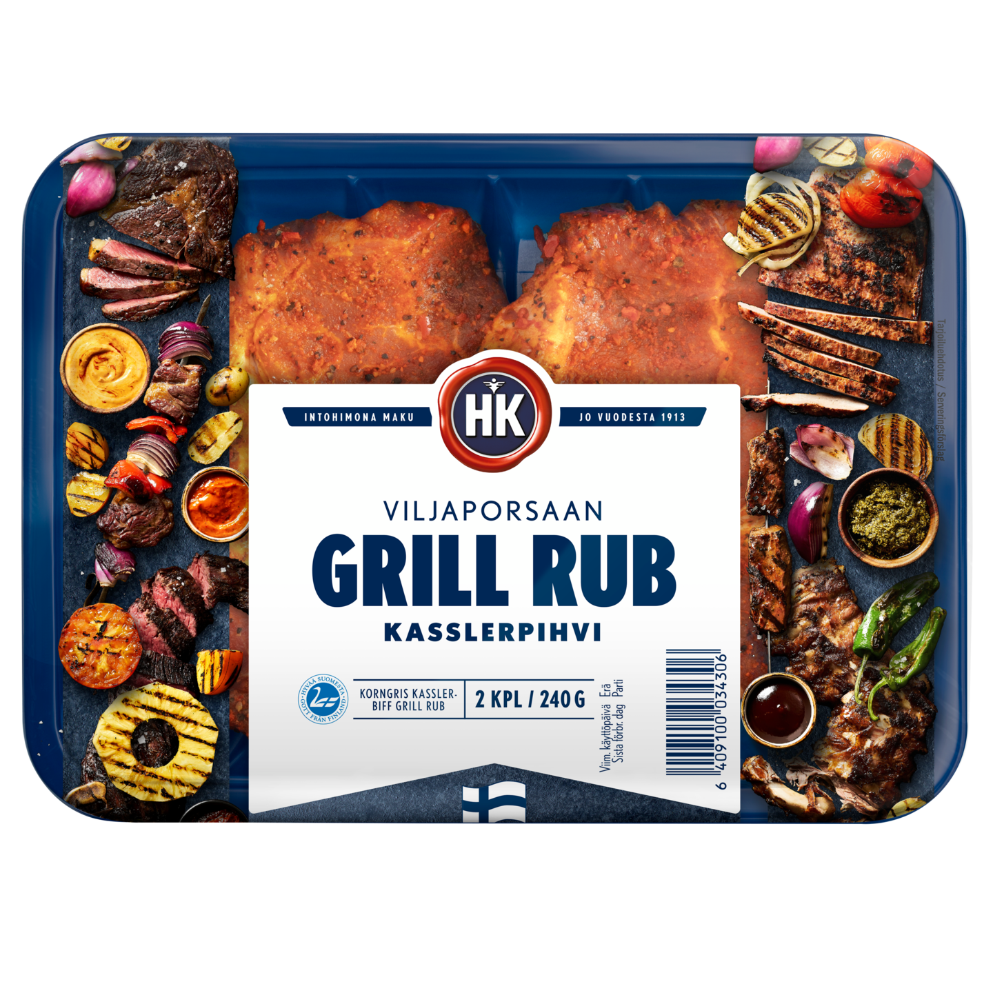 Erikoisleikatut HK Viljaporsaan grill rub kasslerpihvit pienemmässä pakkauksessa. Maustettu tuttuja grillimausteita kuten paprikaa ja mustapippuria sisältävällä rouhealla rub pintamausteella. Nämä sopivat erinomaisesti grillattavaksi, mutta ovat mehukkaita myös pannulla ja uunissa valmistettuna. Ota pakkaus huoneenlämpöön n. 30 min ennen valmistusta. Paista tai grillaa kuumalla pannulla, öljytilkassa n. 15 min. välillä käännellen. Tuote on valmistettu suomalaisesta kotitiloillamme vastuullisesti kasvatetusta viljaporsaan lihasta. Lajittele pakkaus käytön jälkeen muovina.