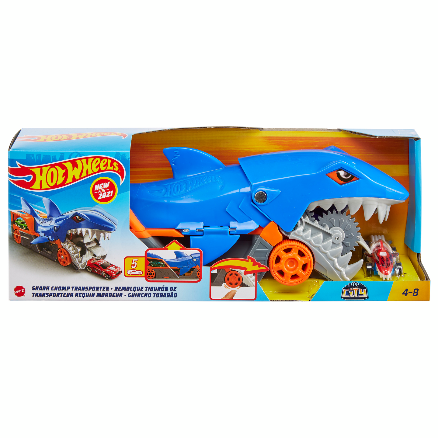 Hurjan näköinen hai-kuljetusrekka haukkaa Hot Wheels -pikkuautoja kitaansa säilöön. Lastin purku onnistuu helposti takana olevan rampin kautta. Autojen siivoaminen ei koskaan ole ollut hauskempaa! Haihin mahtuu 5 pikkuautoa. Mukana 1 pikkuauto. 4+