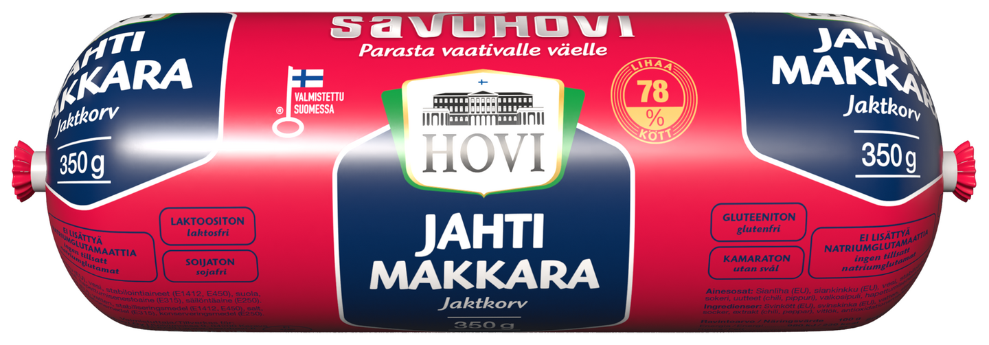 Savuhovin jahtimakkara on Suomessa valmistettu 78% lihaa sisältävä tankomakkara. Maukas jahtimakkara sopii mainiosti leivän päälle siivutettuna.