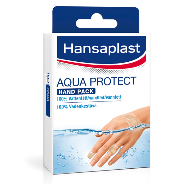 Hansaplast Aqua Protect -sormilaastari on vesitiivis laastari, joka on tarkoitettu suojaamaan erityisesti sormien, rystysten ja sormenpäiden haavoja. Joustava, vesitiivis kalvo suojaa haavaa vedeltä suihkussa ja uidessa. Tarttumaton haavatyyny pehmustaa ja suojaa haavaa. Hyvä tarttuvuus varmistaa laastarin pysymisen paikoillaan ja se mukautuu sormien liikkeisiin. Pakkaus sisältää kolmen eri muotoa eri tarpeisiin. Normaalit ja erikoispitkät laastarit suojaavat sormia ja perhosenmuotoinen laastari sormenpäitä. Käyttö: Puhdista haava ja pyyhi lika, hiekka ja muut mahdolliset roskat varovasti pois. Kuivaa haavaa ympäröivä iho huolellisesti ja kiinnitä laastari venyttämättä sitä.