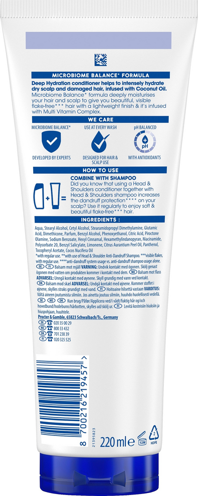 Head & Shoulders Deep Hydration Hilsehoitoaine on suunniteltu kaikille hiuksille. Tämä Kookosöljyä sisältävä hoitoaine auttaa intensiivisesti kosteuttamaan kuivaa päänahkaa ja vaurioituneita hiuksia. Sen Microbiome Balance -koostumus on täynnä Multi Vitamin Complexia, ja se kosteuttaa hiuksia ja päänahkaa syvältä, joten hiukset tuntuvat vastustamattoman pehmeiltä, ilman näkyviä hiutaleita. Käytä yhdessä Head & Shouldersin hilsesampoon kanssa tehostaaksesi hiusten ja päänahan suojaa hilsettä vastaan.