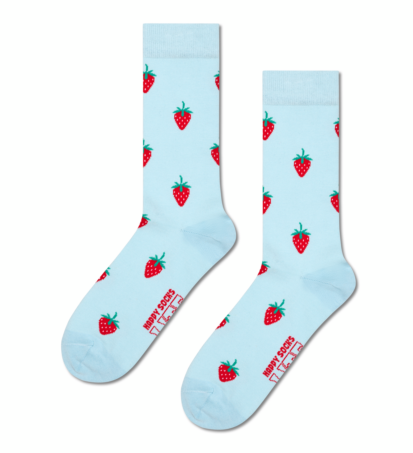 Viileän makeat mansikka-sukat! Vaaleansinisellä pohjalla kuvioina herkullisen punaisia mansikoita. Sukissa vahvistetut kanta- sekä kärkiosio ja sukan pohjassa kudottu Happy Socks LITE -logo. Koon 36-40 sukan varsi 19cm, resori 4cm. Materiaali: 65% Puuvilla, 24% Polyesteri, 10% Polyamidi, 1% Elastaani.