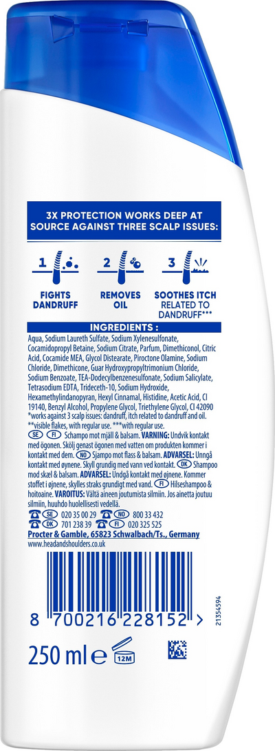 Head & Shoulders 2in1 Apple Fresh Hilseshampoo kaikille hiuksille & päänahoille, toimii jopa sitkeää hilsettä vastaan. Päivittäiskäyttöön sekä miehille että naisille tarkoitettu shampoo, jonka Microbiome Balance -koostumus iskee hilseen perimmäiseen syyhyn ylläpitäen tasapainoista päänahan mikrobiomia. Toimii sekä näkyvää että näkymätöntä hilsettä vastaan vapauttamalla 2x enemmän suojaavia ainesosia, jotka menevät huokosiin ja estävät lopulta pinttyneen hilseen palamisen. Tämän 2in1-sampoon koostumus sisältää 25 % enemmän hoitavia aineita kuin tavallinen Head & Shoulders -sampoo ja on kliinisesti todistettu, dermatologisesti testattu ja pH-tasapainoinen.