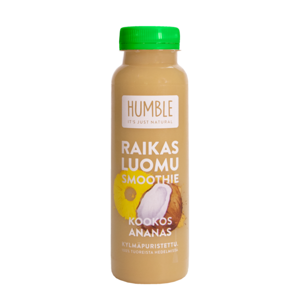 Ihanan raikas ja virkistävä kookos-ananas smoothie. Tämä Humblen luomu smoothie on kylmäpuristettu ja 100% tuoreista hedelmistä valmistettu, taatusti terveellinen ja virkistävä. Kylmäpuristamalla hedelmien vitamiinit ja hivenaineet säilyvät, eivätkä tuhaodu samalla tavalla kuin kuumennuksessa. Sisältää vain hedelmien oman sokerin, eikä lainkaan lisäaineita. Pastoröimaton.