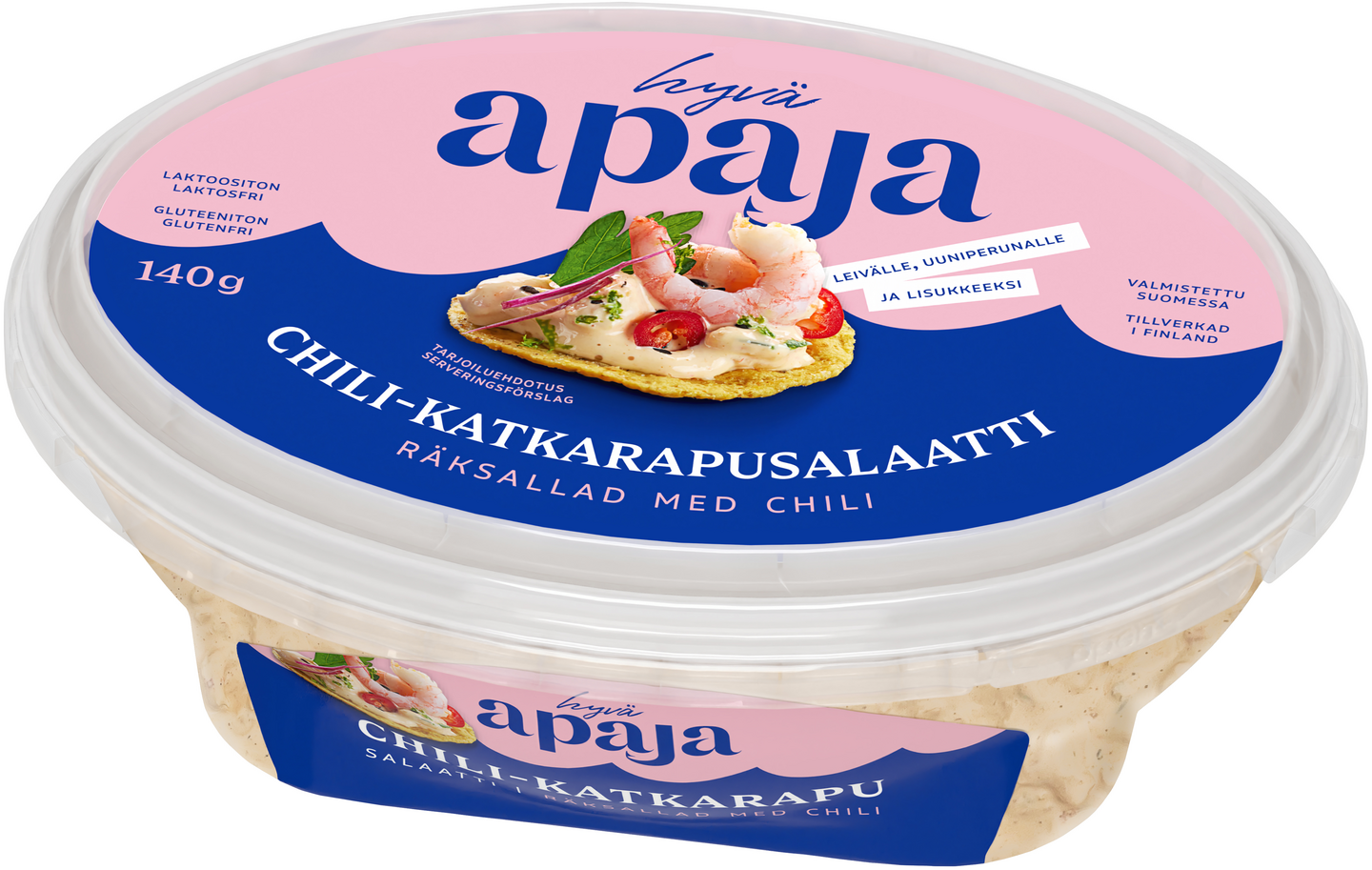 Hyvä Apaja Chili-katkarapusalaatissa on runsaasti MSC-sertifioituja katkarapuja (40%) ja hieman potkua chilistä. Monikäyttöinen katkarapusalaatti sopii erinomaisesti tarjottavaksi kalaruokien kanssa, tortillan, salaattien ja erilaisten leipien täytteeksi ja lisukkeeksi. Majoneesipohjainen chili-katkarapusalaatti on maidoton, laktoositon ja gluteeniton. Koukuttavan hyvät Hyvä Apaja salaatit valmistetaan Suomessa.