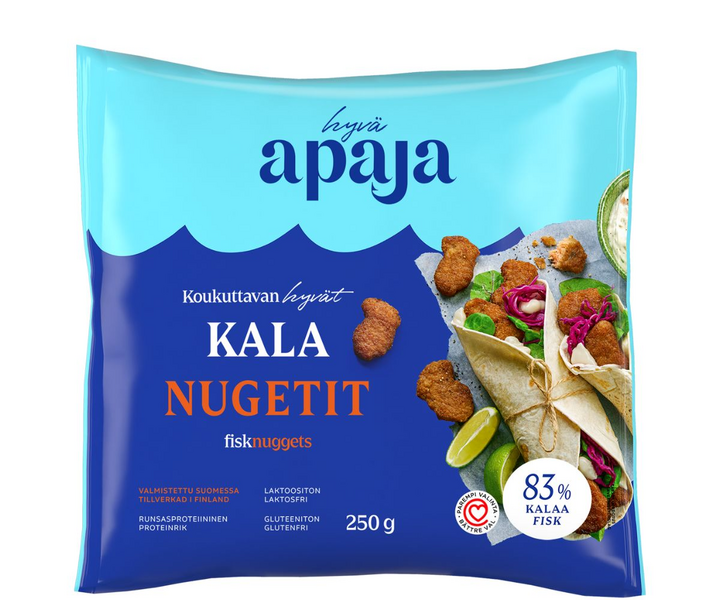 Hyvä Apaja kypsät kalanugetit sisältävät runsaasti kalaa (83%) sekä omega-3 ja omega-6 -rasvahappoja. Koko perheen kalanugetit valmistuvat helposti uunissa, airfryerissa, pannulla tai mikrossa. Nauti perunamuusin kanssa, tai vaikkapa tortillassa tai hodarissa. Dippaa Hyvä Apaja Remouladen kanssa. Koukuttavan hyvät Hyvä Apaja Kalanugetit valmistetaan Ahvenanmaalla.