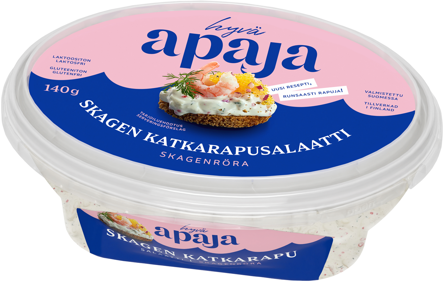 Hyvä Apaja Skagen Katkarapusalaatti valmistetaan MSC-sertifioiduista katkaravuista, ja saaristolaisperinteitä vaalien. Se sopii niin arkeen kuin juhlaan - leivälle ja ruisnapille, uuniperunan ja wrapin täytteeksi tai sellaisenaan lisukkeeksi. Majoneesi- ja kermaviilipohjainen skagen katkarapusalaatti on laktoositon ja gluteeniton. Koukuttavan hyvät Hyvä Apaja salaatit valmistetaan Porvoossa.