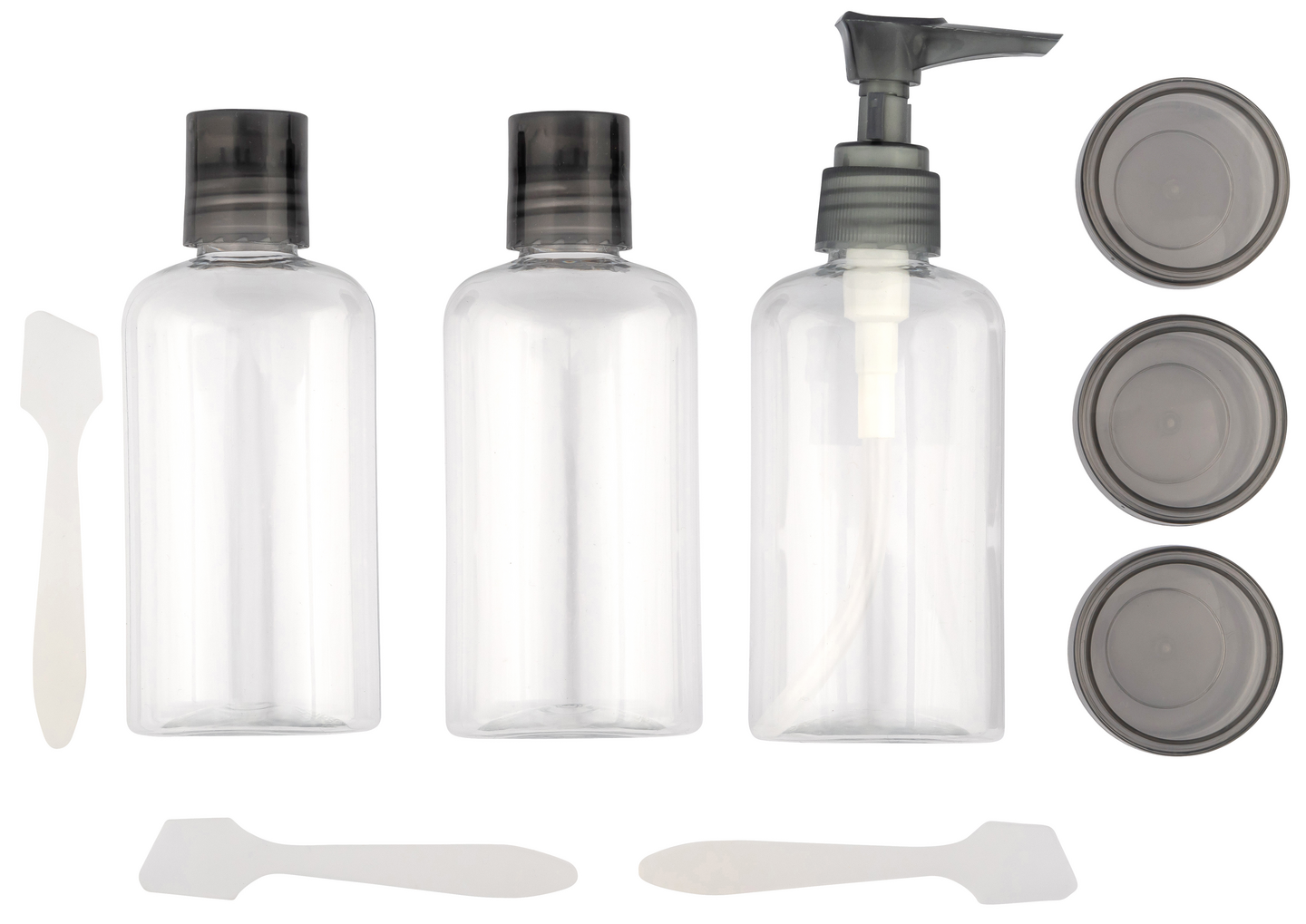 Matkalle mukaan otettava setti, joka sisältää 3 kpl täytettäviä pulloja, 3 kpl täytettäviä purnukoita ja 3 kpl lastoja kosmetiikkatuotteiden annosteluun. Sisältää myös läpinäkyvän pussukan.