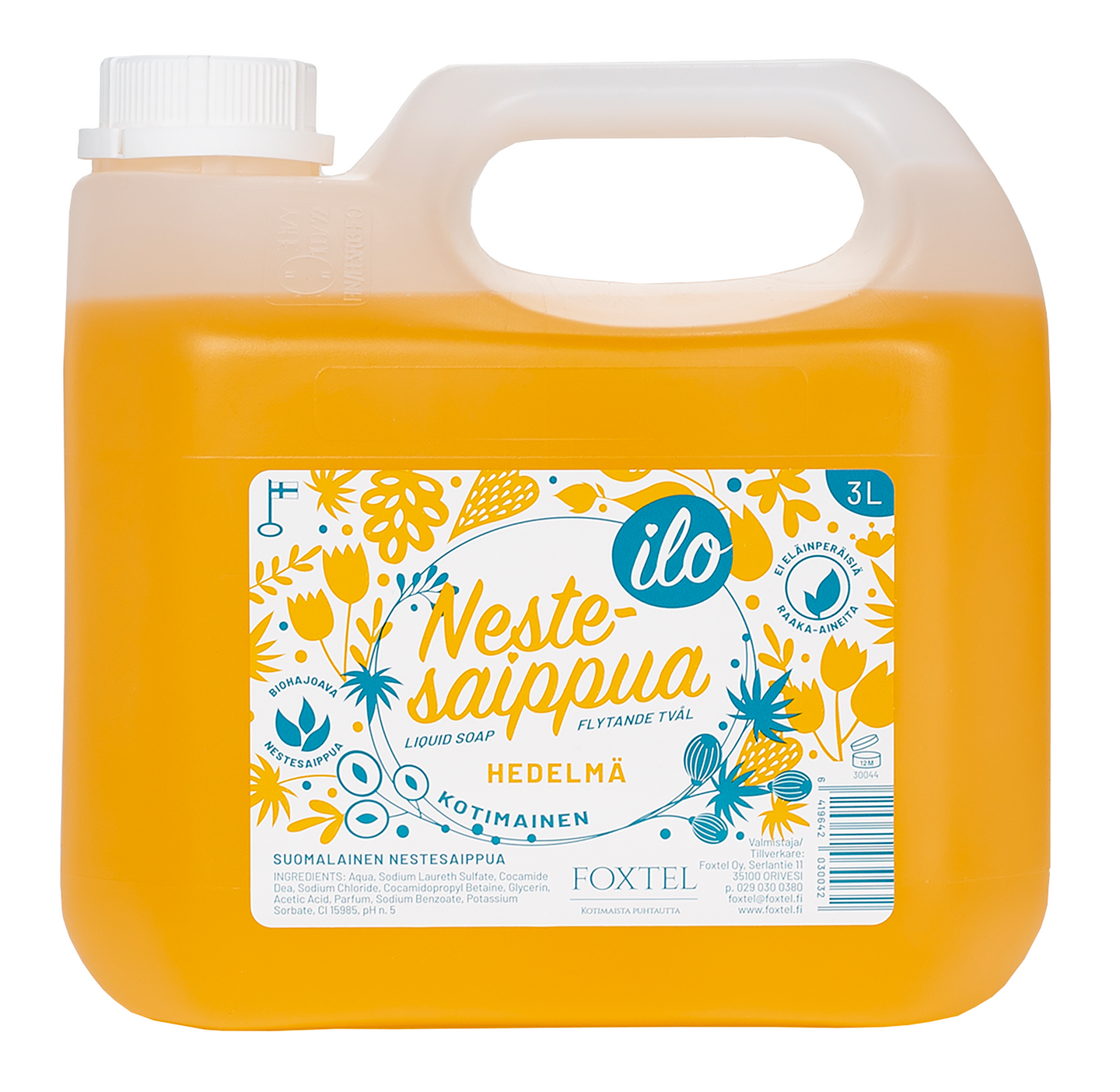 Kotimaiset Ilo Nestesaippuat ovat valmistettu hellävaraisista uuden polven raaka-aineista, ja ne sopivat käsien ja koko vartalon pesuun. Ilo Nestesaippuoissa ei ole käytetty eläinperäisiä raaka-aineita ja ne ovat biohajoavia. 3 L kanisterista voi täyttää 500 ml ilo Nestesaippua pumppupullon. Ilo Nestesaippuoille on myönnetty Avainlippu-merkki osoituksena suomalaisesta työstä. Hedelmän tuoksuinen.