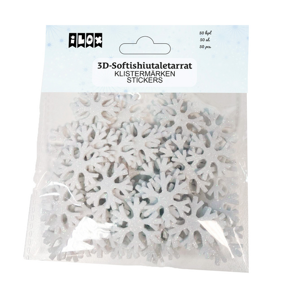 ILOX 3D tarroilla koristelet kauniisti, kortit paketit ja muut somisteet. Pakkauksessa 50 itseliimautuvaa lumihiutaletta glitterillä.