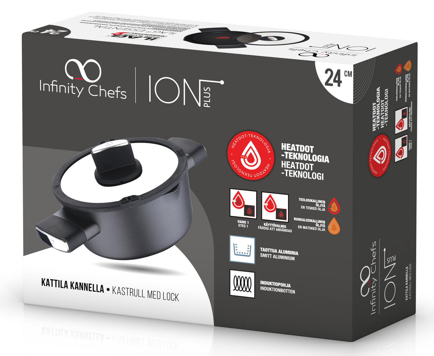 Infinity Chefs Ion Plus -kattila on käytännöllinen ja loppuun asti mietitty kokonaisuus, jossa jokainen yksityiskohta on harkittu ja hiottu. Taotusta alumiinista valmistettu Infinity Chefs Ion Plus -kattila johtaa lämpöä hyvin kuumeten tehokkaasti ja nopeasti. Kattilan pinta on päällystetty tarttumattomalla ILAG® Essential- pinnoitteella, joka ei sisällä PFOA- ja PFOS-yhdisteitä. Helppokäyttöisyyden viimeistelee Heatdot-teknologia; kun optimaalinen paistolämpötila on saavutettu, kattilan sisäpinnassa oleva Heatdot-lämpötunnistin muuttuu kauttaaltaan punaiseksi.