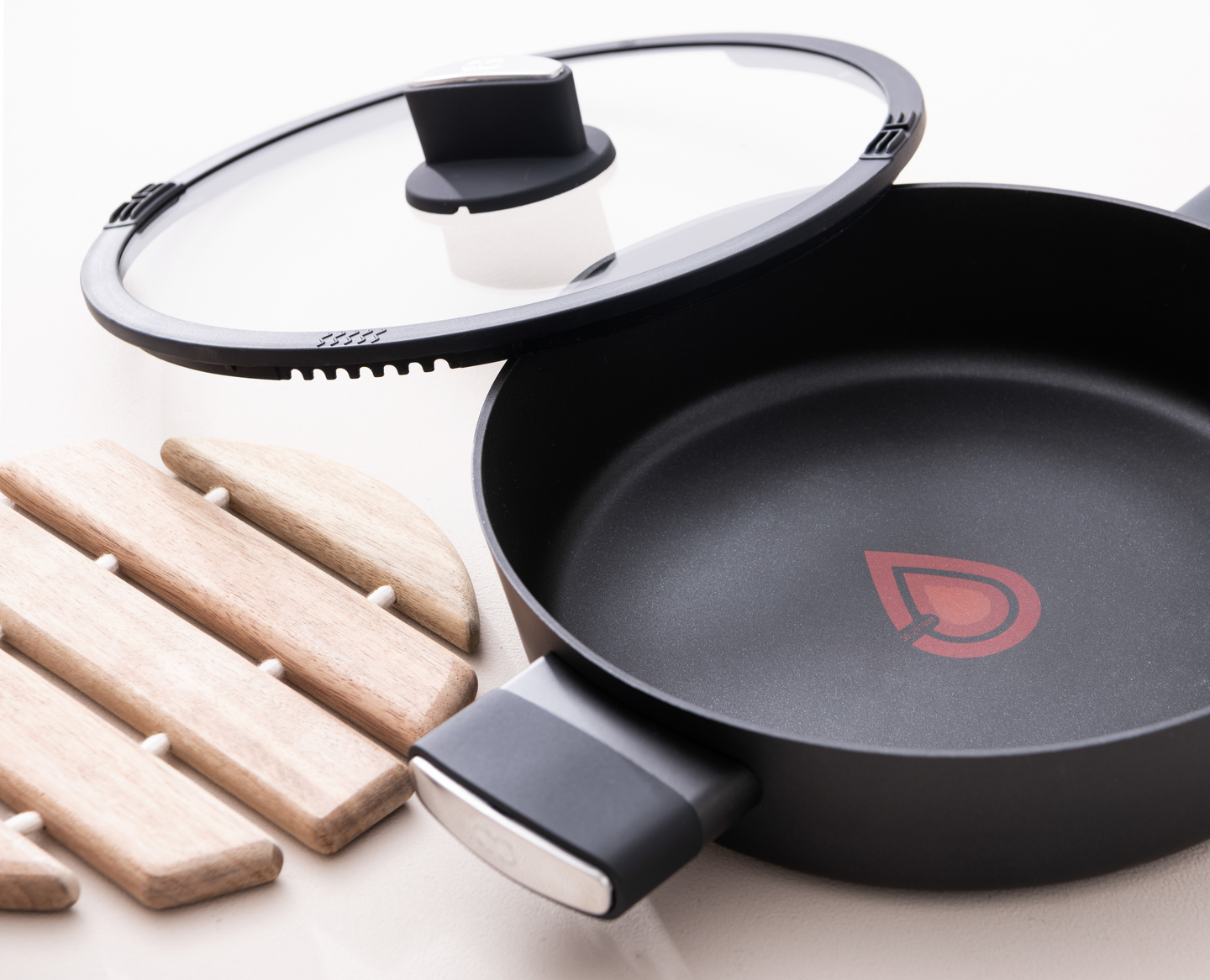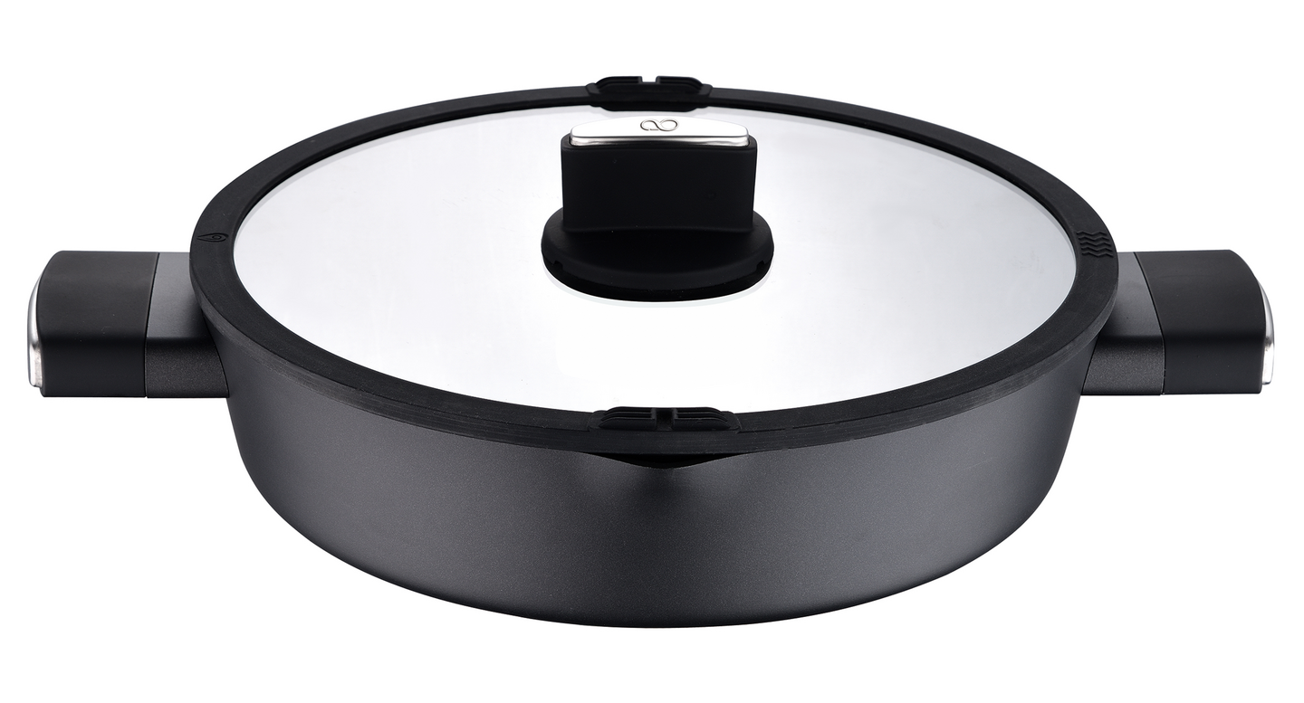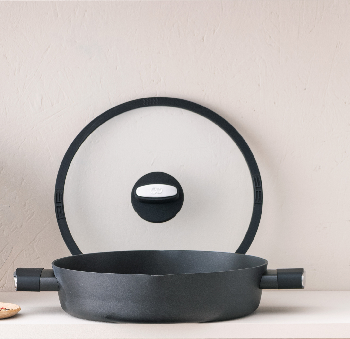 Silikonireunainen lasikansi asettuu paikoilleen hiljaisesti ja pehmeästi paistoastian pinnoitetta naarmuttamatta. Paistokasarin reunoissa on kummallakin puolella kaatohuuli, mikä tekee runsaampien ja enemmän nestettä sisältävien ruokien hauduttamisesta ja tarjoilemisesta sujuvaa. Kahvan Soft Touch -materiaali tuntuu miellyttävältä ja takaa pitävän otteen, eikä kuumene käytössä. Soveltuu kaikille liesityypeille.
