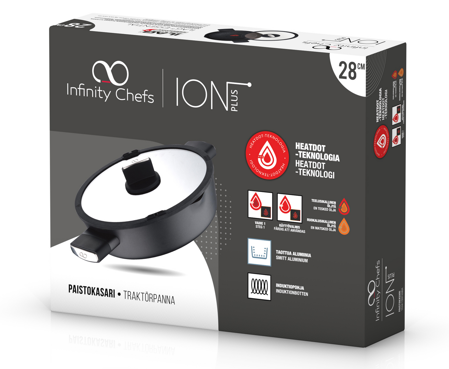 Infinity Chefs Ion Plus -paistokasari on käytännöllinen ja loppuun asti mietitty kokonaisuus, jossa jokainen yksityiskohta on harkittu ja hiottu. Taotusta alumiinista valmistettu Infinity Chefs Ion Plus -paistokasari lämpenee tasaisesti reunojaan myöten antaen ruoalle upean paistopinnan. Paistokasarin pinta on päällystetty tarttumattomalla ILAG® Essential- pinnoitteella, joka ei sisällä PFOA- ja PFOS-yhdisteitä. Helppokäyttöisyyden viimeistelee Heatdot-teknologia; kun optimaalinen paistolämpötila on saavutettu, pannun sisäpinnassa oleva Heatdot-lämpötunnistin muuttuu kauttaaltaan punaiseksi taaten erinomaisen paistotuloksen.