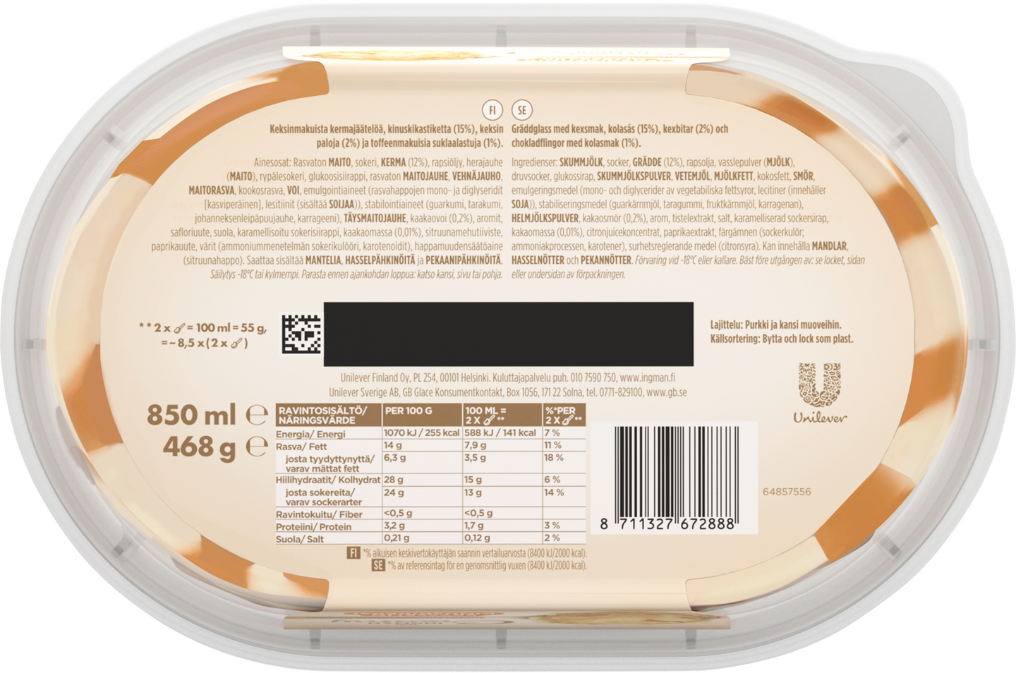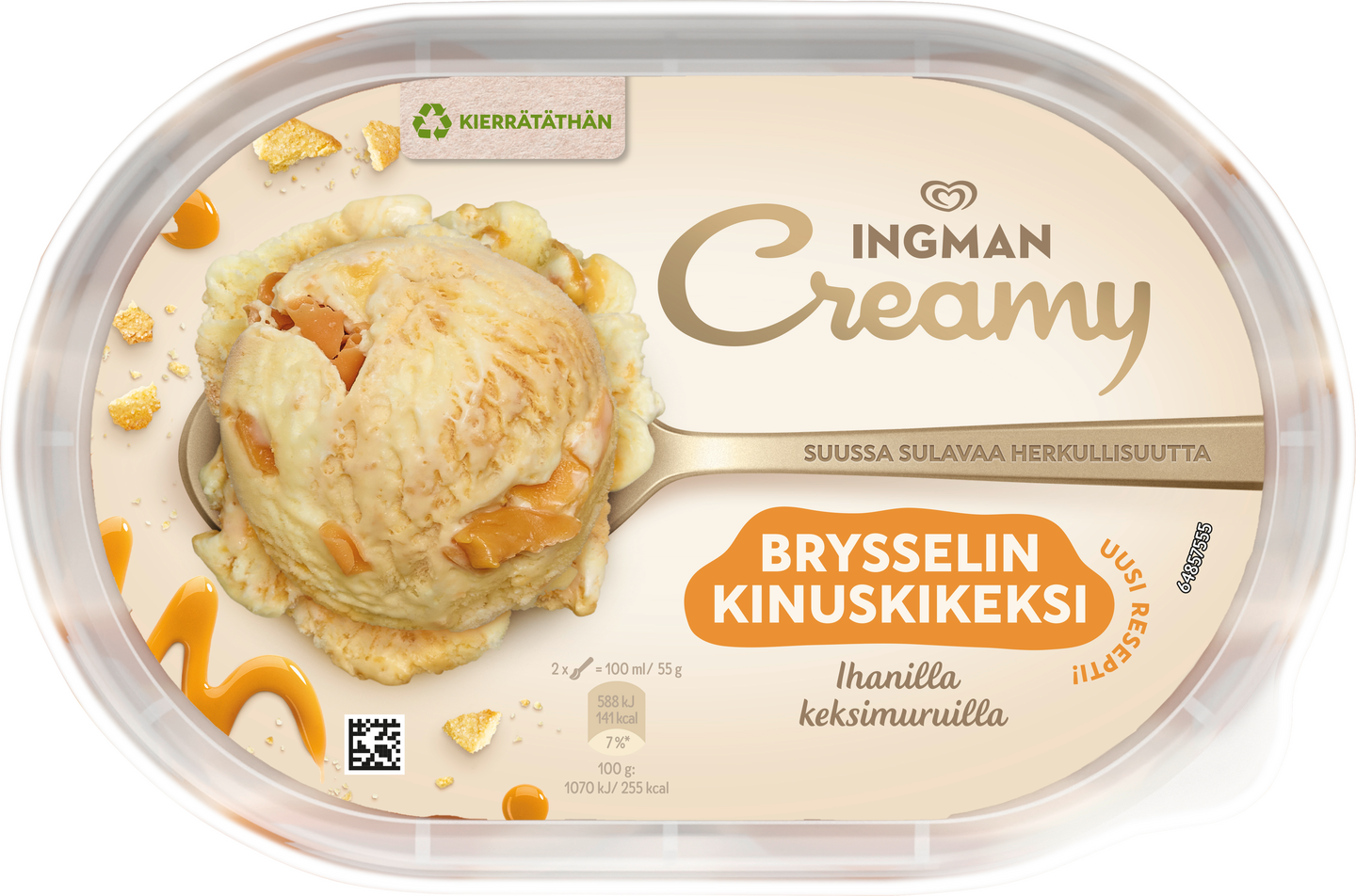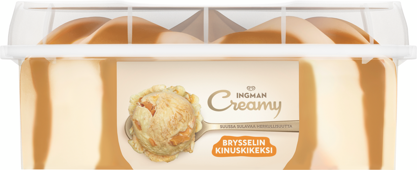 Ingman Creamy Brysselin kinuskikeksi 850 ml on herkullinen yhdistelmä keksinmakuista kermajäätelöä, ihanan makeaa kinuskikastiketta sekä keksimuruja ja toffeenmakuisia suklaalastuja. Makumatka herkutteluun voi alkaa. Ingman Creamy Brysselin kinuskikeksi on herkullisen pehmeä jäätelö, jossa maistuu keksi, kinuski, toffee ja suklaa – vastustamaton yhdistelmä, joka jää taatusti mieleen. Tämä upea jäätelö täydentää täydellisesti minkä tahansa jälkiruuan ja maistuu erityisesti kinuskin ja keksin ystäville. Tämän Ingman Creamy -jäätelön herkullisen pehmeä kokonaisuus tekee siitä unohtumattoman makuelämyksen. Onpa kyseessä hyvin ansaittu tauko, erityistilaisuuteen tarkoitettu jälkiruoka tai yksinkertaisesti jäätelöherkku jaettavaksi ystävien kanssa – Ingman Creamy tekee jokaisesta hetkestä aivan erityisen. Ingman Creamy – yhdessä teemme elämästä herkullisempaa. Ingman Creamy tuo suosituimmat jälkiruokamaut ja suomalaiset suosikit herkulliseen jäätelömuotoon. Ingman Creamy -jäätelöt ovat ihanan pehmeitä ja suussa sulavan herkullisia. Ingman Creamy sopiikin täydellisesti niin juhlaviin hetkiin, itsensä hemmotteluun kuin jälkiruokapöydän kruunaajaksi. Jäätelö ilostuttaa niin arjen pienissä hetkissä kuin suuremmissa juhlissa – hymyn resepti on yksinkertainen. Jäätelövalikoimasta löytyy vaihtoehtoja jokaiseen makuun ja kaikkiin tilanteisiin, hemmotteluhetkiin yksin tai muiden kanssa. Tiesitkö tämän jäätelöstä? Ihmiset ovat jo pitkään ihmetelleet, miksi jäätelön syöminen saa tuntemaan onnea ja nautintoa. Mysteerin ratkaisivat vuonna 2013 brittiläiset tutkijat, jotka analysoivat syitä siihen, miksi jäätelön syöminen saattaa lisätä tyytyväisyyden ja hyvän olon tunteita. Tiimi havaitsi, että jäätelön ja onnellisuuden välillä oli merkittävä yhteys. Mikä tahansa yhdistelmä kiitollisuutta lisäävää toimintaa ja jäätelön syömistä – yksin tai yhdessä – lisäsi myönteisiä tuntemuksia. Ingman Creamy – tehty jaettavaksi.