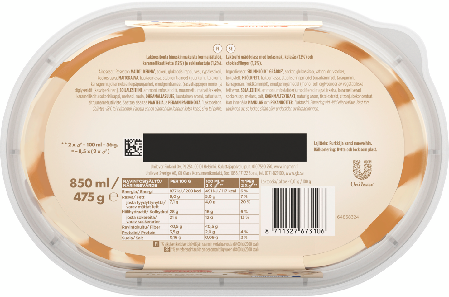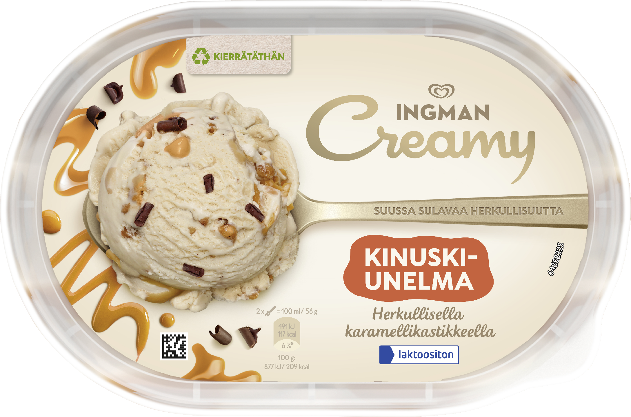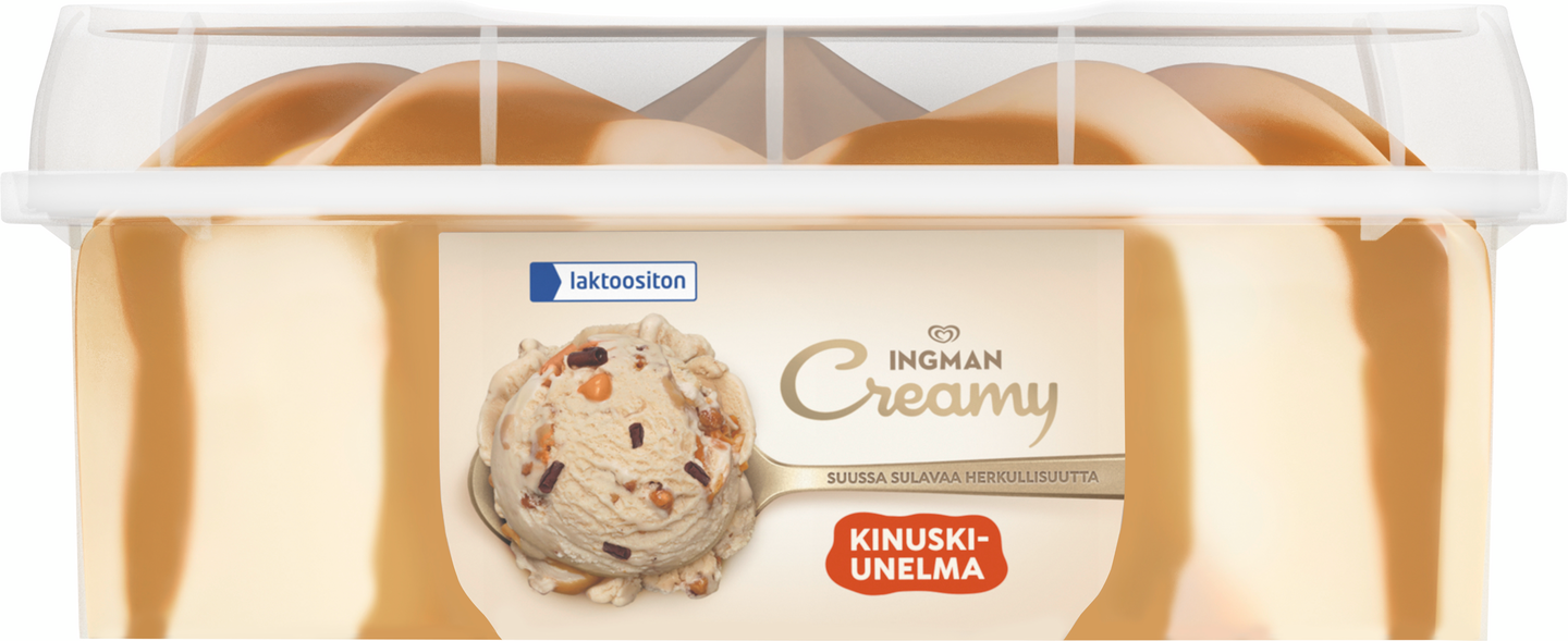 Etsitkö herkullista jälkiruokaa? Ingman Creamy Kinuskiunelma Laktoositon Jäätelö 850 ml on etsimäsi! Ingman Creamy Kinuskiunelma on yhdistelmä samettisen pehmeää kinuskinmakuista kermajäätelöä, ihanalla karamellikastikkeella ja suklaalastuilla. Herkullinen yhdistelmä kaikille kinuskin ja karamellin rakastajille. Ihanan pehmeä kermajäätelö, herkullinen kinuski, suussa sulava karamellikastike ja rapea suklaa ovat vastustamaton yhdistelmä, joka jää mieleen. Tämä upea jäätelö täydentää täydellisesti minkä tahansa jälkiruuan ja maistuu erityisesti kinuskin ja karamellin ystäville. Kinuskisen Ingman Creamy -jäätelön herkullisen pehmeä kokonaisuus tekee siitä unohtumattoman makuelämyksen. Onpa kyseessä hyvin ansaittu tauko, erityistilaisuuteen tarkoitettu jälkiruoka tai yksinkertaisesti jäätelöherkku jaettavaksi ystävien kanssa – Ingman Creamy tekee jokaisesta hetkestä aivan erityisen. Ingman Creamy – yhdessä teemme elämästä herkullisempaa. Ingman Creamy tuo suosituimmat jälkiruokamaut ja suomalaiset suosikit herkulliseen jäätelömuotoon. Ingman Creamy -jäätelöt ovat ihanan pehmeitä ja suussa sulavan herkullisia. Ingman Creamy sopiikin täydellisesti niin juhlaviin hetkiin, itsensä hemmotteluun kuin jälkiruokapöydän kruunaajaksi. Jäätelö ilostuttaa niin arjen pienissä hetkissä kuin suuremmissa juhlissa – hymyn resepti on yksinkertainen. Jäätelövalikoimasta löytyy vaihtoehtoja jokaiseen makuun ja kaikkiin tilanteisiin, hemmotteluhetkiin yksin tai muiden kanssa. Jäätelöidemme tavoitteena on tehdä maailmasta onnellisempi ja osallistavampi paikka yksi hymy kerrallaan. Tiesitkö tämän jäätelöstä? Ihmiset ovat jo pitkään ihmetelleet, miksi jäätelön syöminen saa tuntemaan onnea ja nautintoa. Mysteerin ratkaisivat vuonna 2013 brittiläiset tutkijat, jotka analysoivat syitä siihen, miksi jäätelön syöminen saattaa lisätä tyytyväisyyden ja hyvän olon tunteita. Tiimi havaitsi, että jäätelön ja onnellisuuden välillä oli merkittävä yhteys. Mikä tahansa yhdistelmä kiitollisuutta lisäävää toimintaa ja jäätelön syömistä – yksin tai yhdessä – lisäsi myönteisiä tuntemuksia. Ingman Creamy – tehty jaettavaksi.