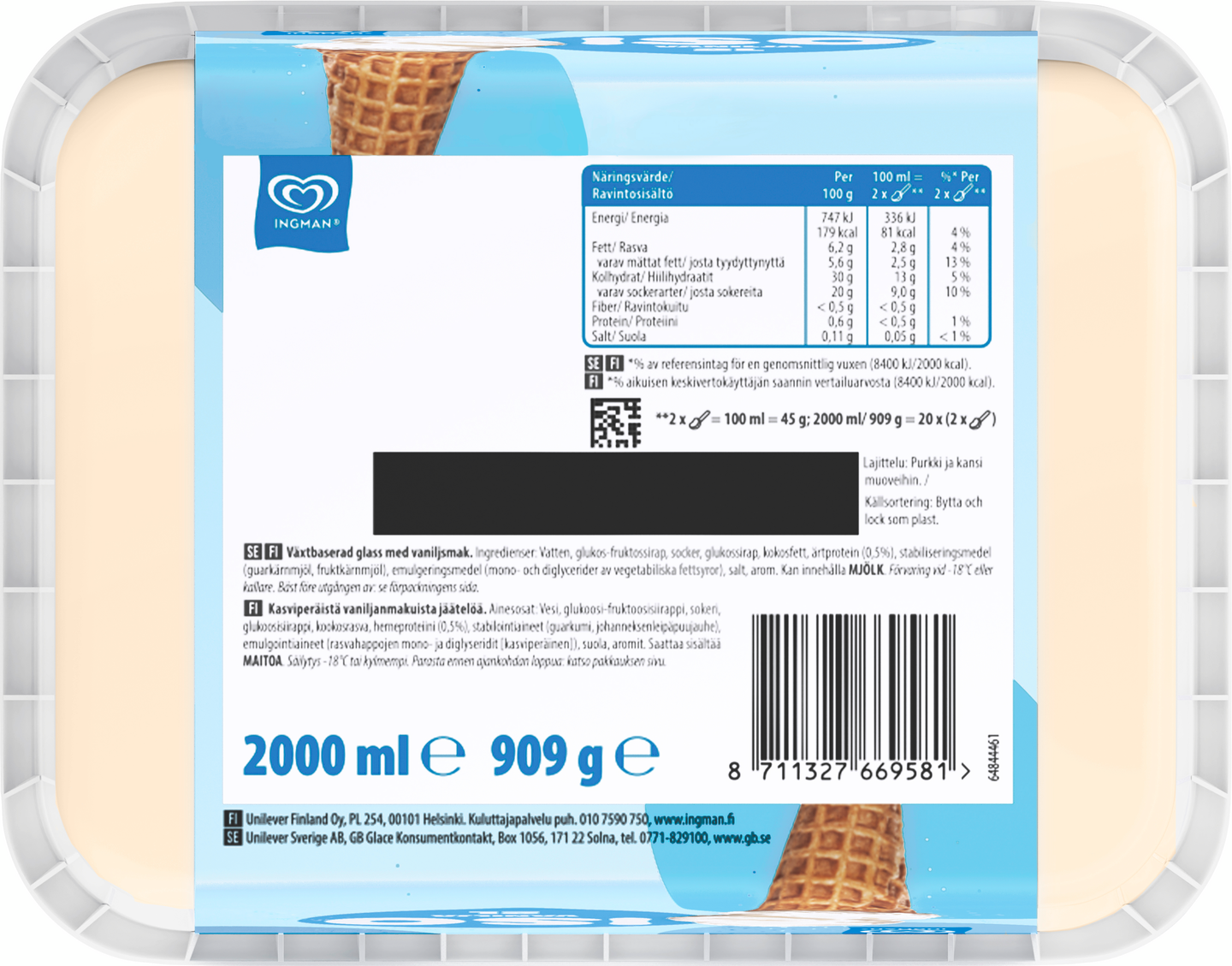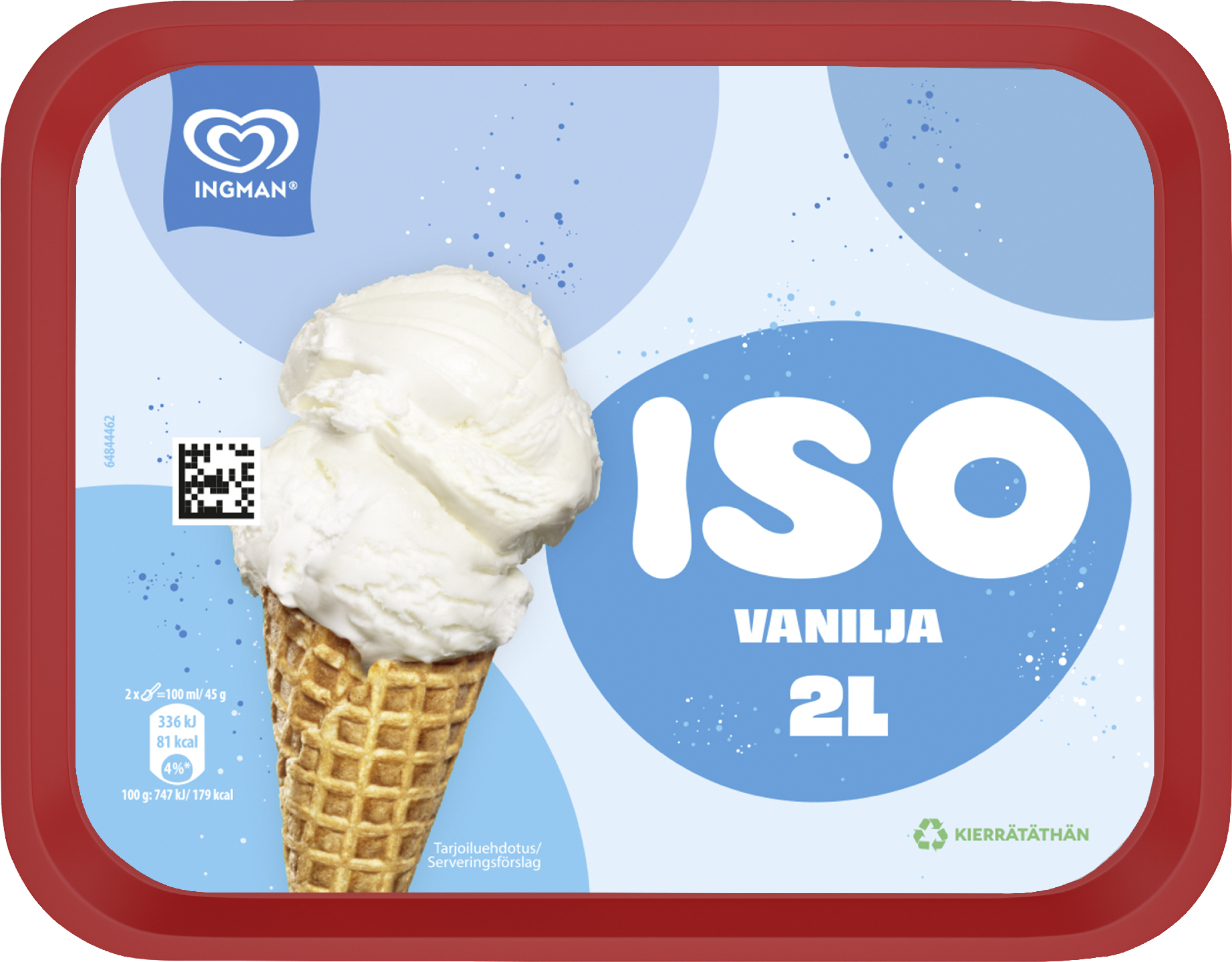 Ingman ISO Vanilja Jäätelö 2L on iso jäätelöpakkaus, jossa on paljon jäätelöä. Kasviperäinen Ingman ISO -jäätelö nyt 2 litran pakkauksessa – jättipakkaus ihanan pehmeää vaniljajäätelöä. Ingman ISO Vanilja on jäätelö, joka sopii niin pienten kuin isojen makuun. Klassinen vaniljajäätelö on kaikkien suosikki, joka on maistuva jälkiruoka tai välipala, leffaillan herkku tai synttäreiden kohokohta. Ingman ISO -jäätelöpaketti sisältää 2 litraa jäätelöä, josta riittää jaettavaa suuremmallekin porukalle. Hanki nyt Ingman ISO Vanilja 2L ja makumatka herkutteluun voi alkaa. Loihdi jäätelöstä maistuva jäätelöannos, nauti sellaisenaan tai yhdistä toisiin jäätelömakuihin – miten ikinä jäätelön nautitkin, luvassa on unohtumaton jäätelökokemus, joka jää mieleen. Ingman ISO -jäätelöpaketissa on paljon jäätelöä, ja se sopii sekä pienien että isojen makuun. Jäätelö on pehmeää jo heti kun otat sen pakastimesta ulos. Se sopii tarjoiltavaksi ihan sellaisenaan – tai jos haluat vielä lisätä herkullisuutta, sopivat O’hoj -kastikkeet herkutteluhetken kruunaamiseen. Valitse suosikkimakusi ja kutsu ystävät jäätelöjuhliin! Ingman ISO on saatavilla vaniljan lisäksi kahdessa eri makuyhdistelmässä: Kolmikko ja Tripletti. Kolmikossa maistuvat mansikka, vanilja ja päärynä. Tripletissa makuina ovat vanilja, suklaa ja kinuski. Meillä Ingmanilla on sydämen asia olla mukana tekemässä hyvää, joka kestää jäätelöäkin pidempään. Ympäristön hyvinvoinnin lisäksi välitämme aidosti ihmisten hyvinvoinnista, erityisesti lasten, nuorten ja lapsiperheiden. Haluamme tehdä yhteiskunnassa hyvää auttamalla lapsia, nuoria ja lapsiperheitä, joiden elämästä syystä tai toisesta puuttuu ilonaiheita. Vuosittain osallistumme hyväntekeväisyysyhteistöihin eri tahojen kanssa. Ingman-jäätelöt ovat olleet osa suomalaisten kuluttajien elämää jo yli 40 vuoden ajan. Meillä on vahva yhteys kaikenikäisten jäätelörakastajien kanssa ja haluamme jatkaa ilon hetkissä mukana olemista. Jäätelövalikoimastamme löytyy tuttuja klassikoita ja jännittäviä uutuuksia, joita kehitämme muuttuvien makujen mukaan, juuri suomalaiseen makuun sopivaksi.