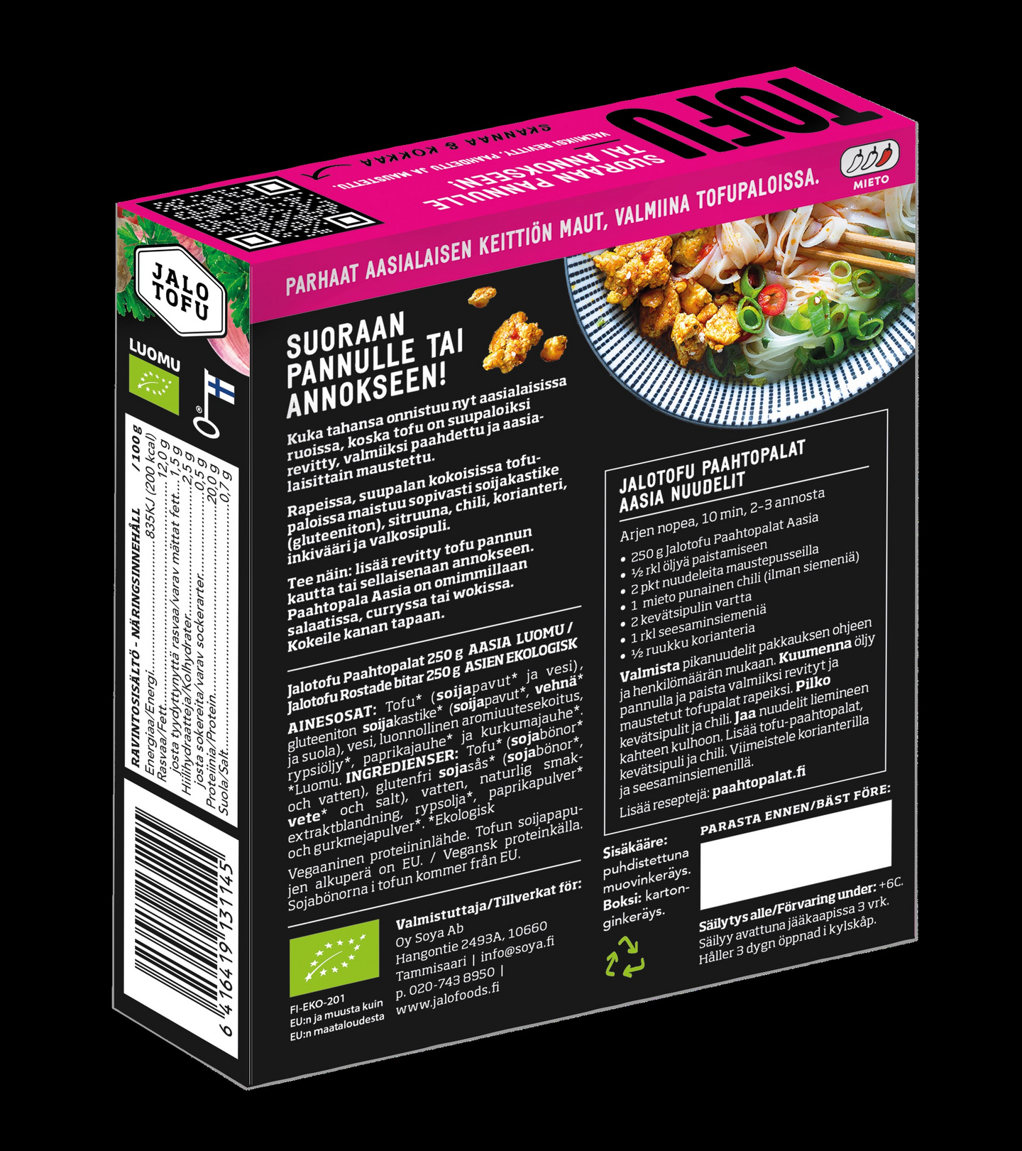 Proteiinipitoinen, kasvispainotteinen ja maukas kotiruoka ei enää voisi olla helpompaa! Valmiiksi revityt, täyteläisen makuisiksi maustetut ja paahdetut Jalotofu Paahtopalat Aasia ovat tofun maukkain uusi muoto. Käytä paahtopaloja kanan tai lihan sijaan tai rohkeasti sellaisenaan. Pakkauksesta suoraan pannulle tai uunipellille kätevästi tyhjennettävät, suuhun sopivat paahdetut tofupalat tarvitsee ainoastaan lämmittää. Kokeile salaateissa, aasialaisissa ruoissa, pasta-annoksissa - tai missä ikinä keksitkään! Paahtopalat ovat luomua, eivätkä sisällä lisäaineita. Inspiroivia kasvisreseptejä löytyy osoitteesta: http://www.jalotofu.fi/reseptit