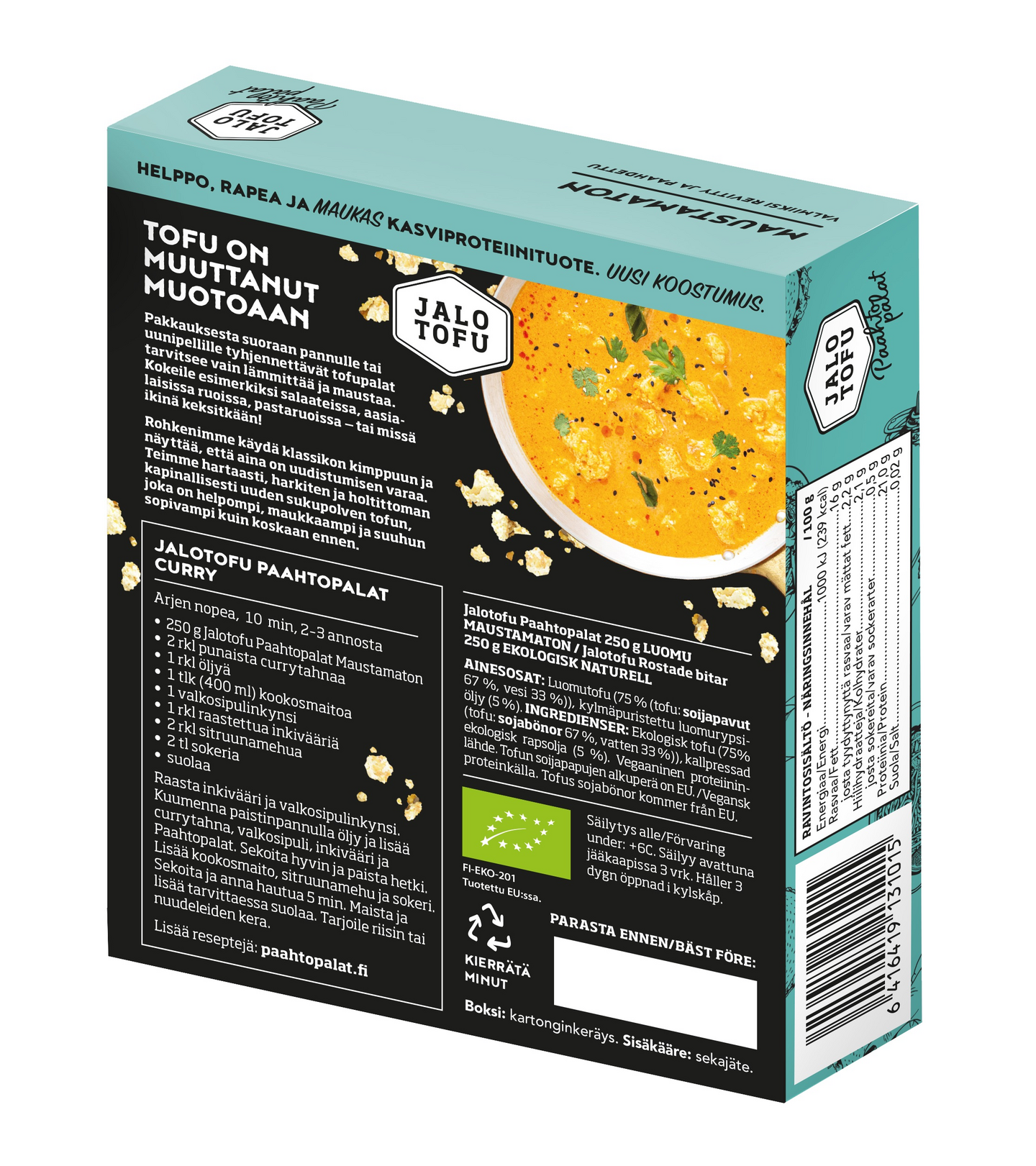 Proteiinipitoinen, kasvispainotteinen ja maukas kotiruoka ei enää voisi olla helpompaa! Valmiiksi revityt ja paahdetut Jalotofu Paahtopalat ovat tofun uusi, maustamaton muoto. Käytä paahtopaloja kanan tai lihan sijaan tai ihan omana maukkaana itsenään. Mausta vain oman maun mukaan! Pakkauksesta suoraan pannulle tai uunipellille kätevästi tyhjennettävät, suuhun sopivat paahdetut tofupalat tarvitsee vain lämmittää ja halutessaan maustaa. Kokeile salaateissa, aasialaisissa ruoissa, pasta-annoksissa - tai missä ikinä keksitkään! Jalotofu Paahtopalat ovat luomua, eivätkä sisällä lisäaineita. Jalotofu Paahtopala -uutuus syntyi halusta ajatella kasvisruokien klassikko, tofu, uusiksi. Teimme sen hartaasti, harkiten ja holtittoman kapinallisesti. Jalotofu Paahtopalat ovat uuden sukupolven tofu, joka on helpompi, maukkaampi ja rapeampi kuin koskaan ennen. Inspiroivia kasvisreseptejä: http://www.jalotofu.fi/reseptit