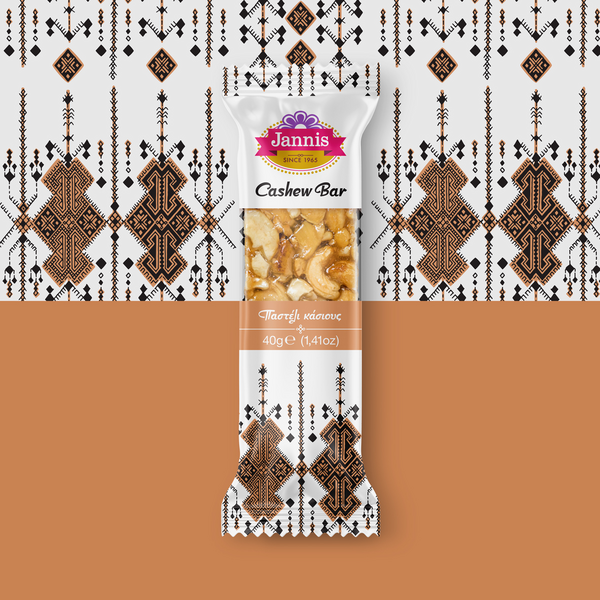 Jannis cashewpähkinä-patukka on herkullinen välipala, joka sisältää cashewpähkinää, glukoosisiirappia ja sokeria.