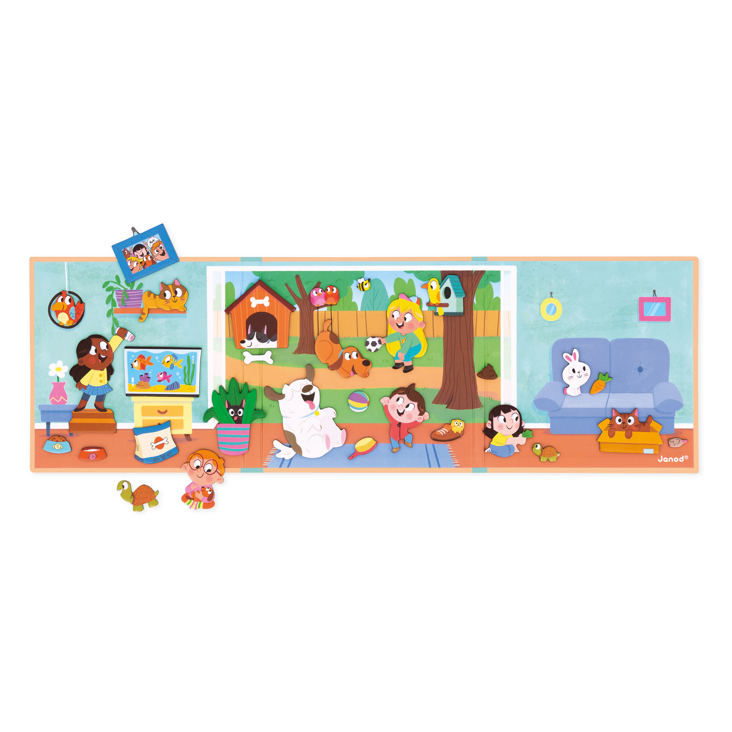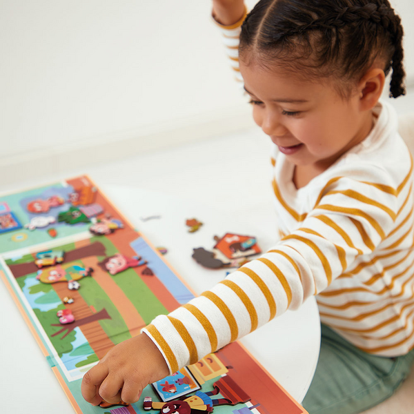 Avaa Janod Magneettileikki ja luo oma tarinasi! Janod Magneettileikki avautuu upeaksi panoraamaleikkialustaksi, jonka sisältä paljastuu runsas määrä lemmikkiaiheisia magneetteja mielikuvitusleikin mahdollistamiseksi. Kiinnitä magneetteja taustaan ja leikki on valmis alkamaan! Kätevä ottaa mukaan matkalle. Mitat avattuna: 55,5 x 18 cm. SISÄLTÖ: Kolmeen osaan avautuva leikkialusta ja 30 magneettia.