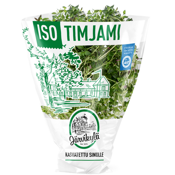 Isompi koko – enemmän yrttiä. Suomalainen, rönsyilevän runsas timjami. Pienet, tuoksuvat lehdet pitävät makunsa pitkässäkin kypsennyksessä. Käytä liha- ja perunaruokiin, jälkiruokiin ja piirakoihin. Järvikylä kannustaa kohti vihreämpää lautasta. Perheyrityksen juuret ulottuvat kartanoon, joka on ollut suvulla vuodesta 1674. Reseptit: www.jarvikyla.fi