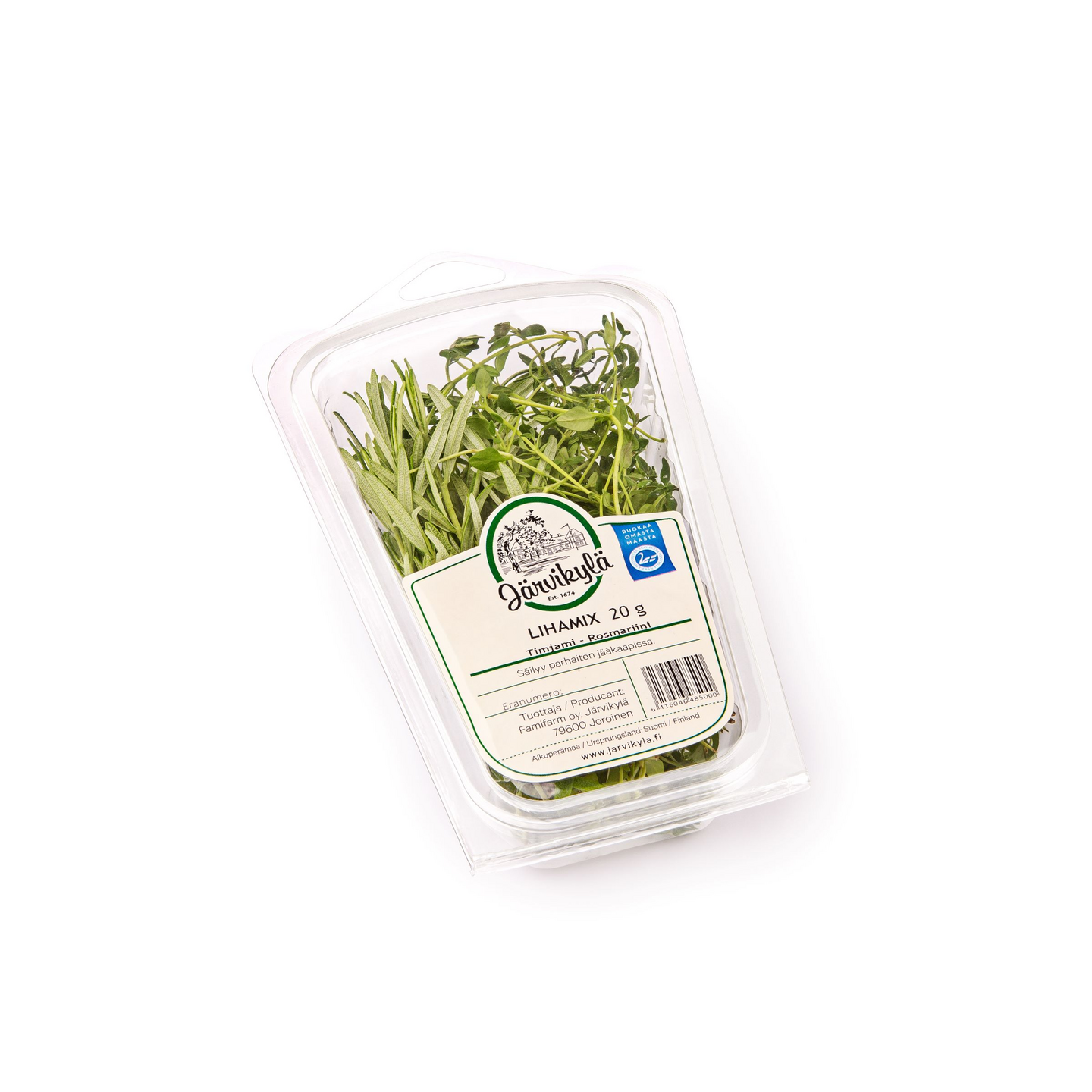 Valmiiksi leikattu yrttimix – säilyy hyvin suljettavassa rasiassa. Suomalaisella timjamilla ja rosmariinilla lisäät helposti makua liharuokiin ja grillaukseen. Järvikylä kannustaa kohti vihreämpää lautasta. Perheyrityksen juuret ulottuvat kartanoon, joka on ollut suvulla vuodesta 1674. Reseptit: www.jarvikyla.fi