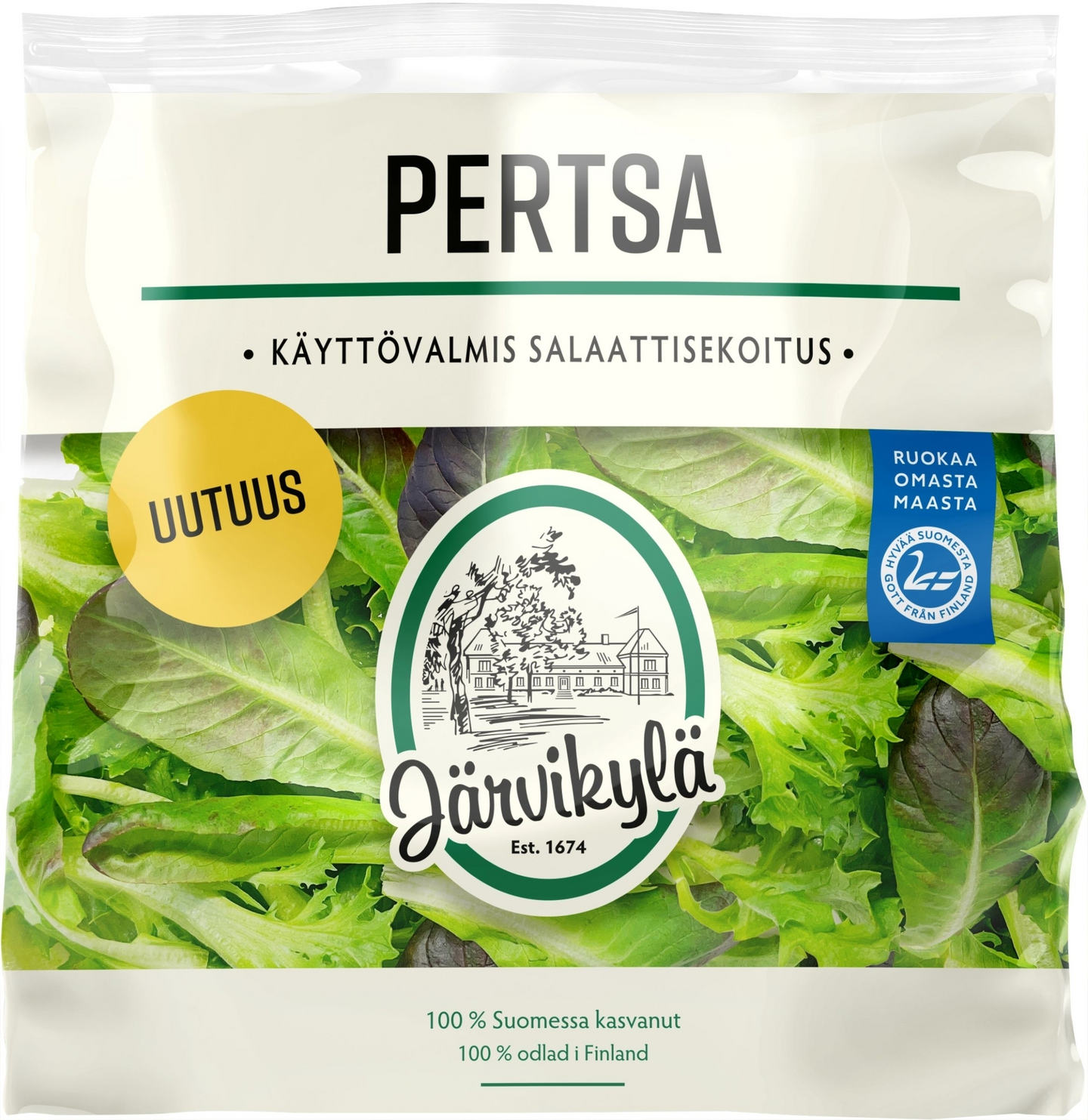 Perusteellisen hyvä perussalaatti! Mieto mutta mehevä ja rapea suomalainen sekoitus on käyttövalmis sellaisenaan, ilman pesemistä. Se on oiva salaattipohja, ruokien lisuke ja leivänpäällinen. Pussista saat neljä lisukesalaattia tai yhden salaattiaterian. Sekoitus voi vaihdella sesongeittain, tarkat ainesosat näet pakkauksesta. Järvikylä kannustaa kohti vihreämpää lautasta. Perheyrityksen juuret ulottuvat kartanoon, joka on ollut suvulla vuodesta 1674. Reseptit: www.jarvikyla.fi