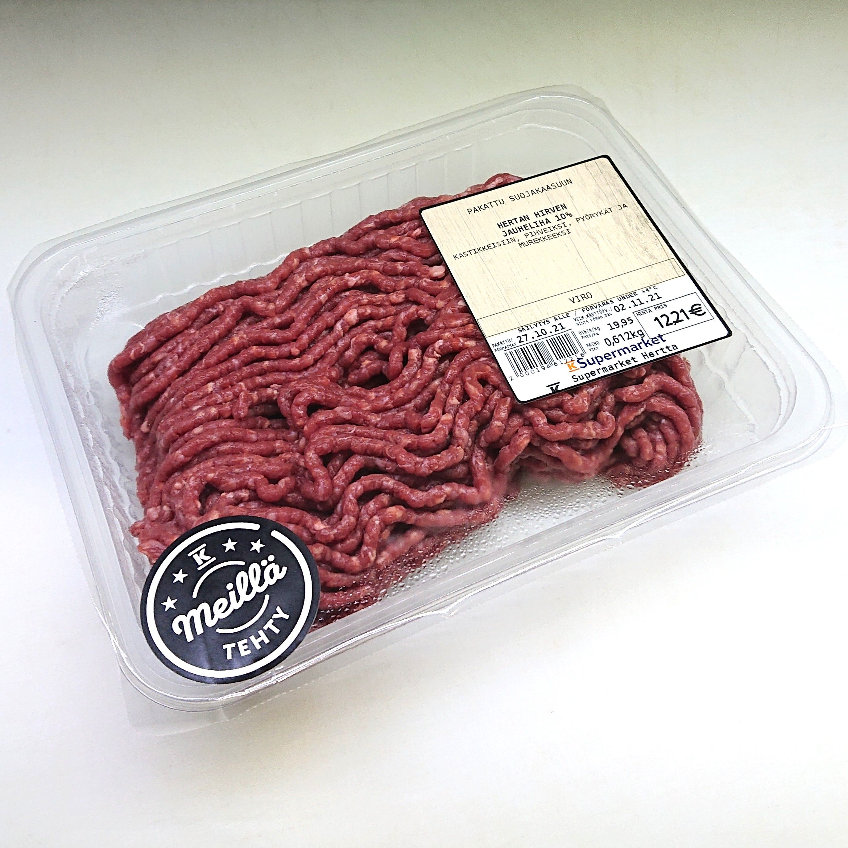 Hertan lihamestarin jauhamaa hirven jauhelihaa. Pakkauksessa n. 400 g. Kastikkeisiin, pihveiksi, pyöryköiksi ja murekkeeksi. Pakattu suojakaasuun.