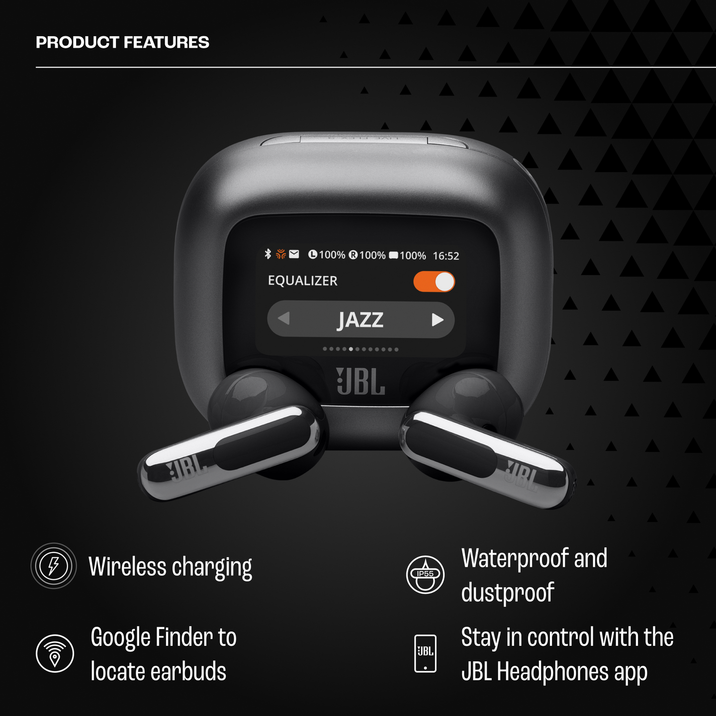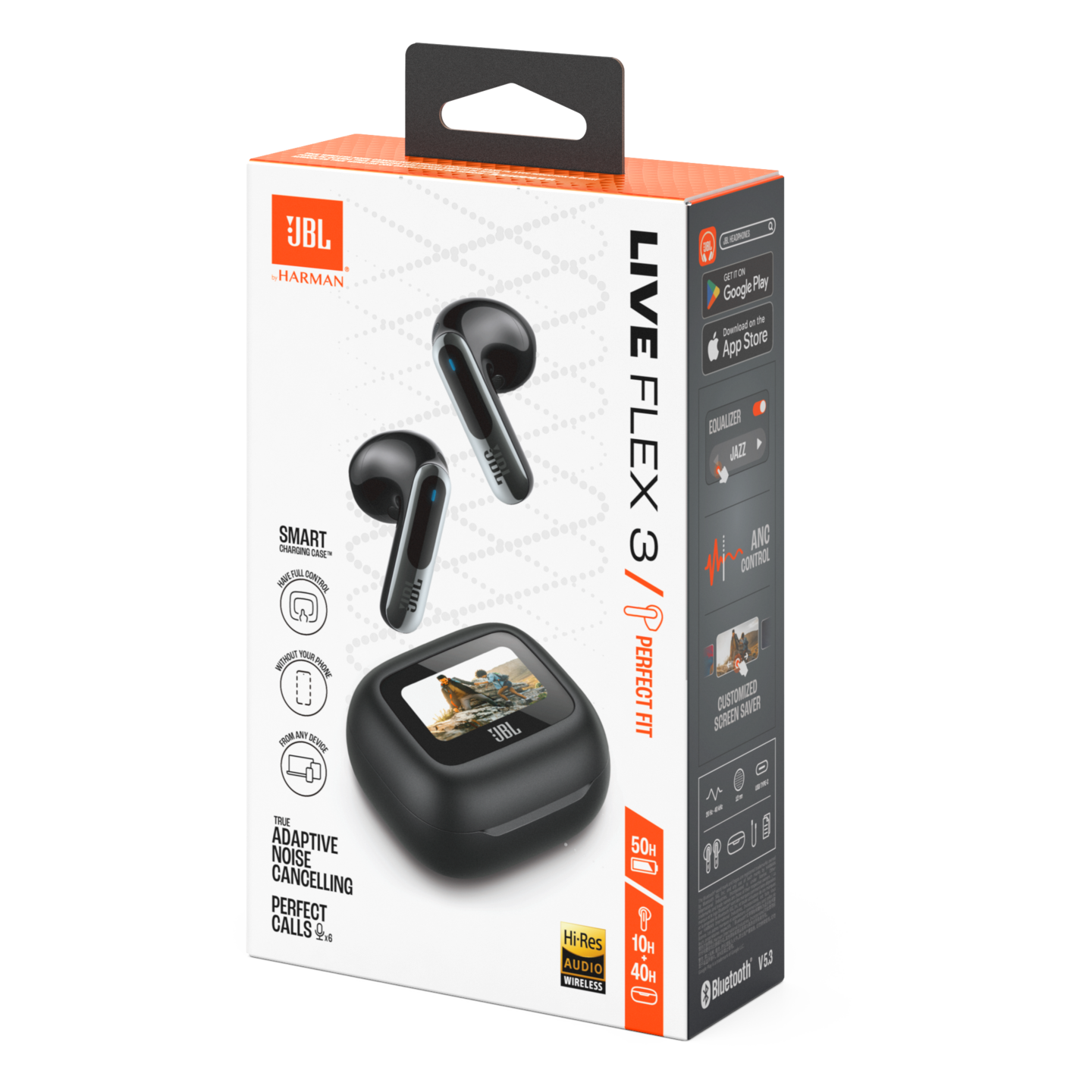 Voit mukauttaa JBL Live Buds 3 -nappikuulokkeiden jokaista yksityiskohtaa Smart Charging Case™ -latauskotelon 1,45 tuuman kosketusnäytöllä. Näytön avulla voit hallita ääntä täysin kaikilla laitteilla – kannettavalla tietokoneella, televisiolla, älypuhelimella tai tabletilla – ilman, että sinun tarvitsee käyttää älypuhelimen JBL-sovellusta.