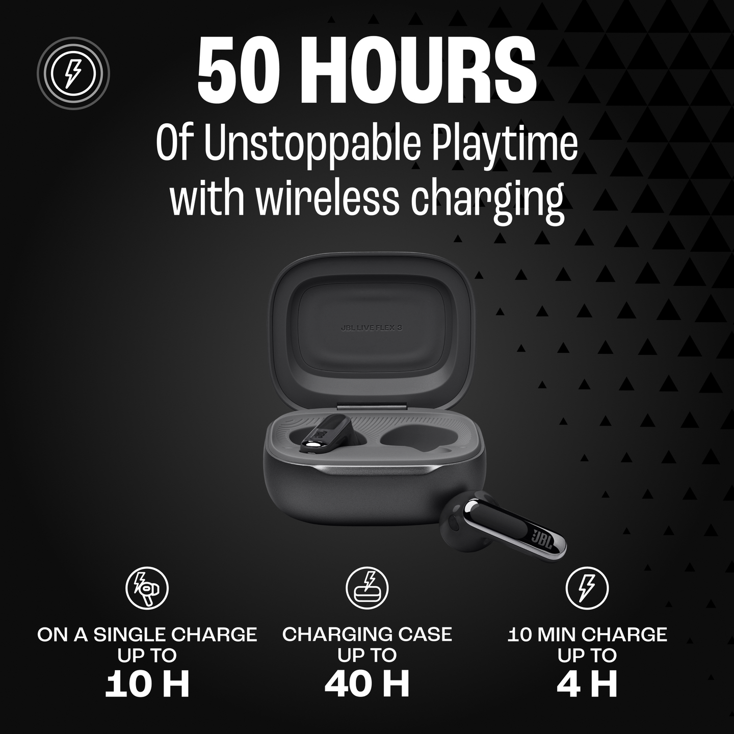 JBL Live Flex 3 -kuulokkeiden 12 mm:n dynaamiset elementit on säädetty täydellisesti tuottamaan syvä basso, tasapainoinen keskialue ja hienostuneet korkeat taajuudet – kaikilla äänenvoimakkuuksilla. JBL:n tilaääni tuntuu siltä kuin olisit konsertissa, sillä ääni tulee lähes kaikkialta ympäriltäsi. Tämä on tunnusomaista JBL- soundia parhaimmillaan.