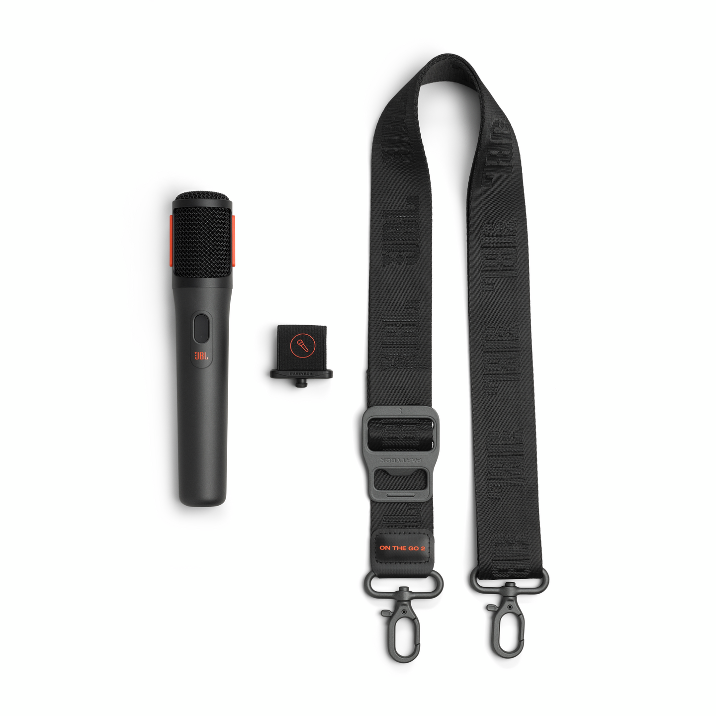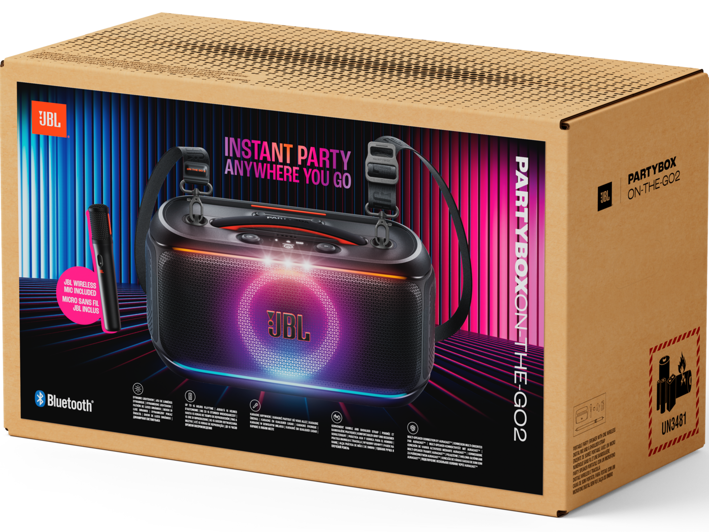 • Pakkauksen sisältö: JBL PartyBox On-The-Go, pikaopas, turvallisuusohjeet ja takuukortti, langaton mikrofoni, olkahihna, Virtajohto
