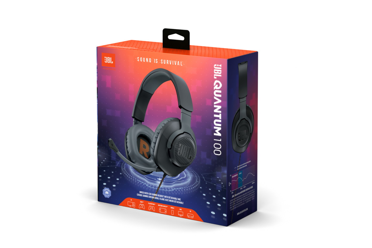 • Pakkauksen sisältö: JBL Quantum 100 -kuulokemikrofoni, irrotettava mikrofoni, tuulisuoja mikrofonille, pikakäynnistysopas, turvallisuustiedot