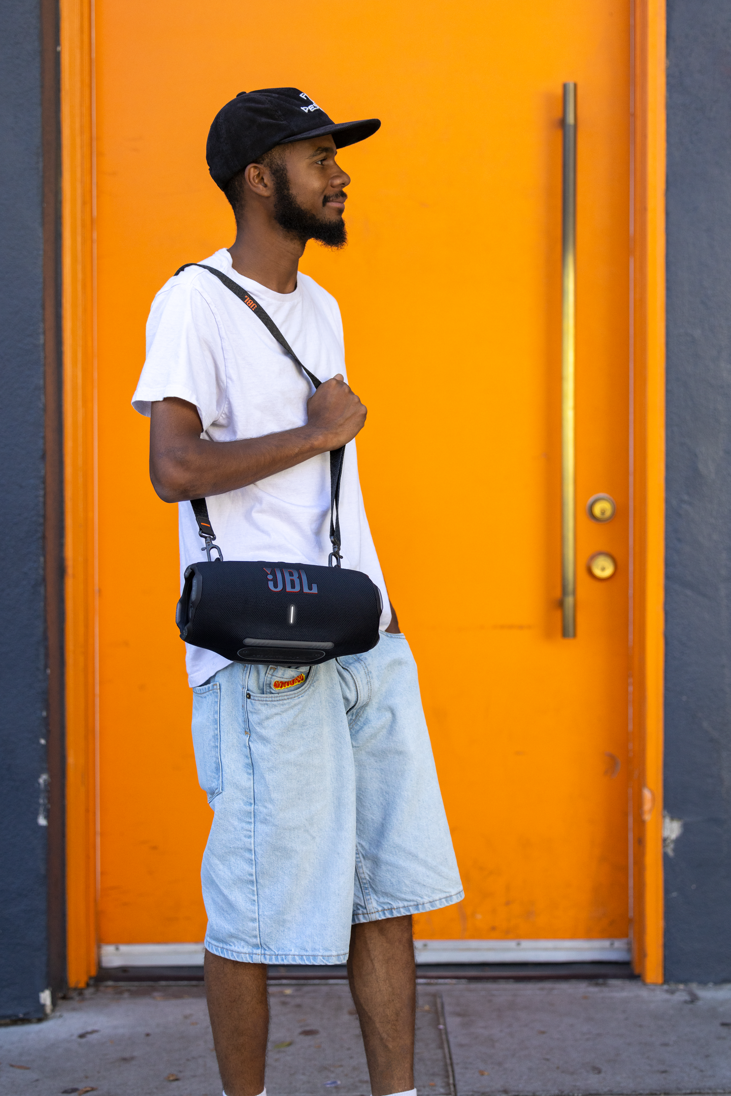 Kaiutinta voi kantaa olalla tai siten, että hihna kulkee rinnan poikki – mikä ikinä tyyliin tai tilanteeseen sopiikin.