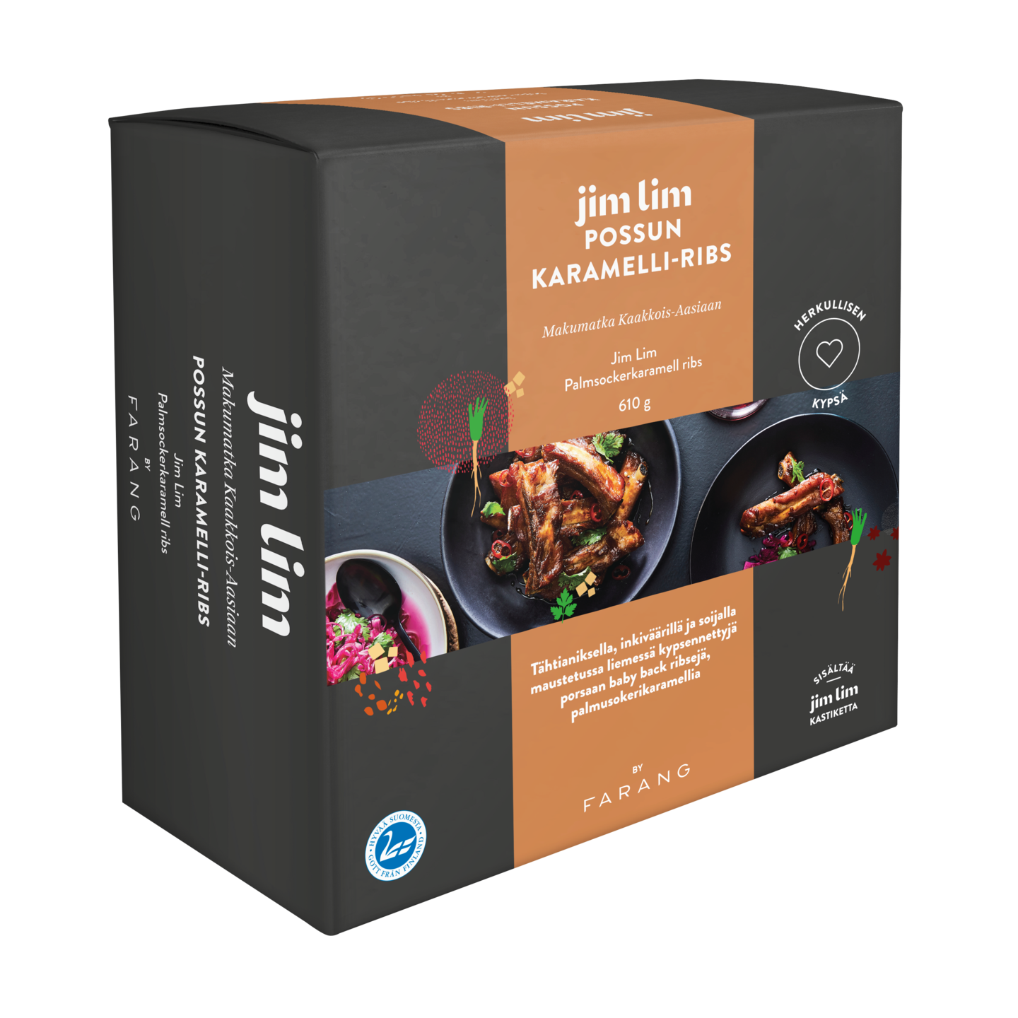 Jim Lim by Farang pitkään haudutetut kypsät viljaporsaan ribsit. Marinadissa maistuu soija, tähtianis ja cassia. Kaiken kruunaa karamellikastike, joka sivellään ribsien pintaan grillauksen tai uunipaahdon jälkeen. Valmistettu suomalaisesta porsaanlihasta.