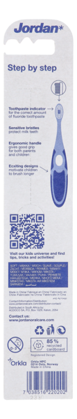 Jordan Step by Step 3-5-vuotiaiden hammasharjassa on pehmeä ja entistä tuuheampi harjaspää. Muotoillusta kahvasta saa hyvän ja pitävän otteen. Harjaspään siniset harjakset auttavat annostelemaan oikean määrän hammastahnaa. 4 eri hahmoa ja väriä. Valitettavasti hahmoa ja väriä ei voi valita verkkokaupasta tilattaessa, toimitus varastotilanteen mukaan.