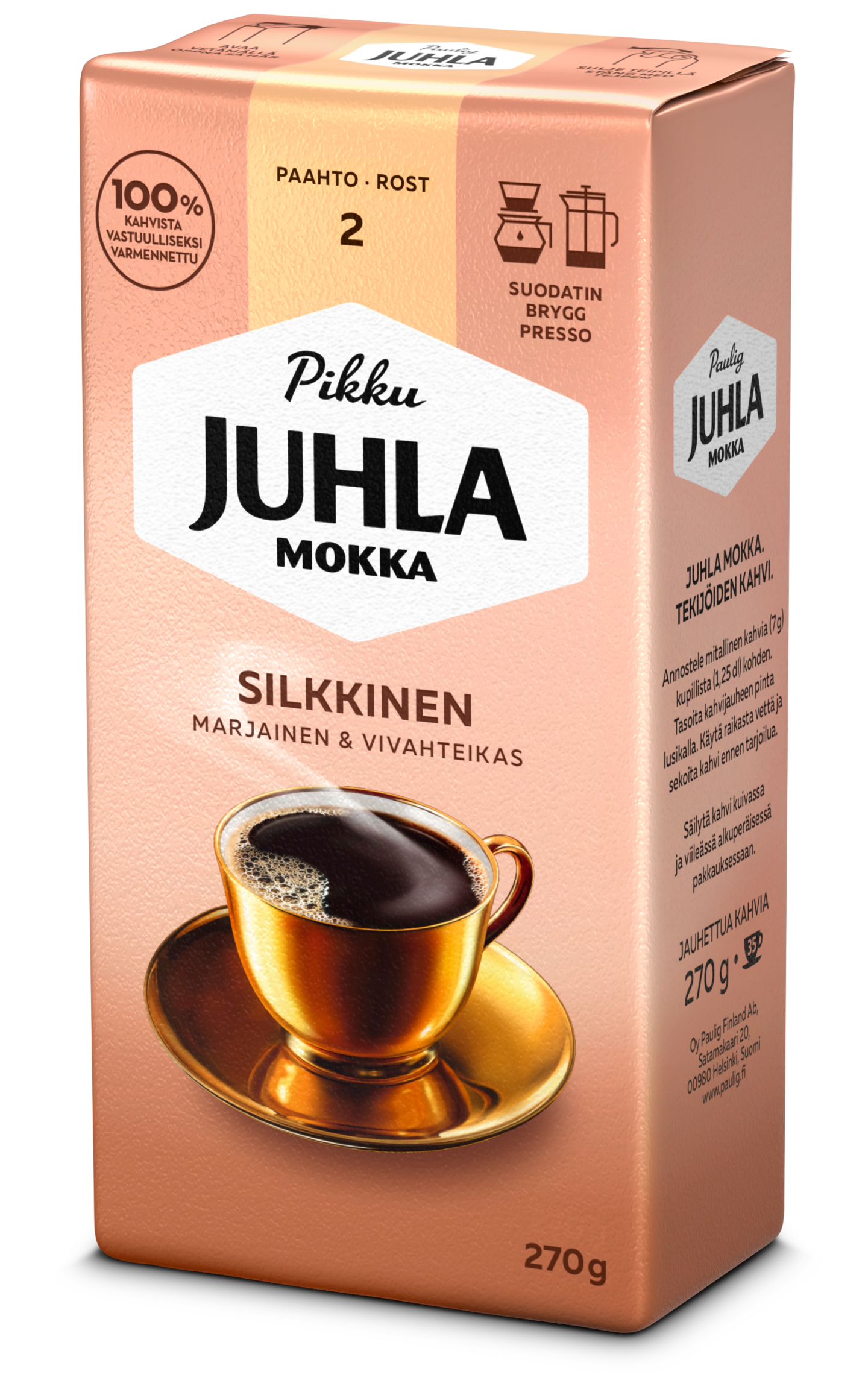 Juhla Mokka Silkkinen on kepeän marjaisa ja vivahteikas, vaaleapaahtoinen arabica-kahvisekoitus. Kahvin rikas ja miellyttävän aromikas makumaailma on peräisin Afrikan ja Etelä-Amerikan parhaista kahvilaaduista. Juhla Mokka Silkkinen on pakkauskooltaan normaalia kahvipakettia pienempi, jonka ansiosta se sopii erinomaisesti esimerkiksi kahvin maisteluun tai kahvia harvoin juoville. 100 % vastuullisesti hankittua kahvia. Paahtoaste 2. • Luonteikas ja ylellinen vaaleapaahto • Valmista suodatinlaitteella tai pressopannulla • Paahtoaste 2 • Pienempi pakkauskoko Juhla Mokka. Tekijöiden kahvi.