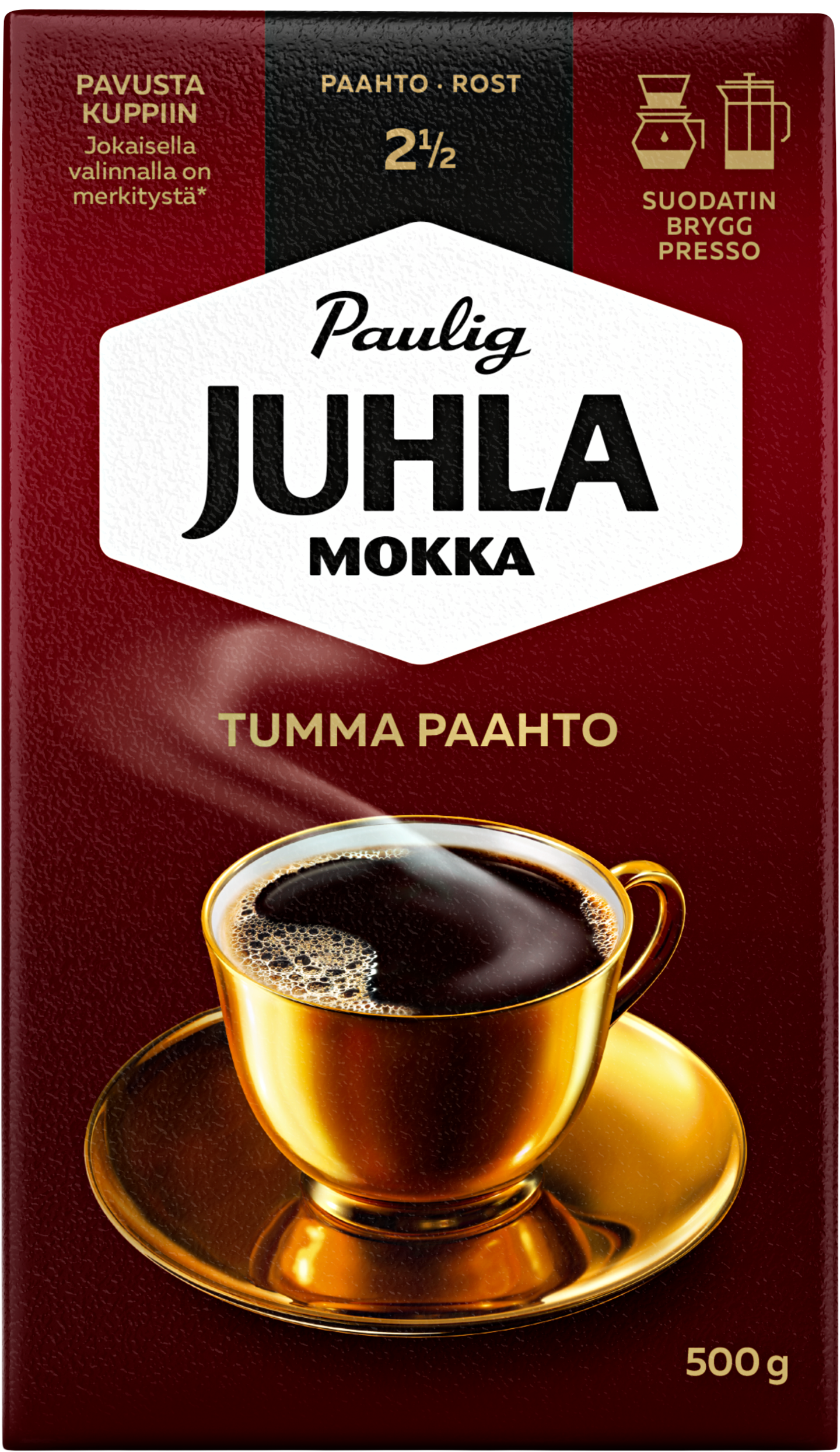 Juhla Mokka Tumma Paahto kahvi on suomalaiseen makuun paahdettu tummapaahtoinen kahvi. Kahvin nautinnollinen ja monien mieleen oleva maku on täyteläinen, pähkinäinen ja paahteisen lämmin. Juhla Mokka Tumma Paahto kahvi on paahteinen ja viipyilevä 100 % arabica-kahvisekoitus Keski- ja Etelä-Amerikan sekä Afrikan parhaista kahvilaaduista. Juhla Mokka Tumma Paahto on varma valinta jokaiseen kahvipöytään sellaisenaan tai maidon kanssa kotona, työpaikalla ja juhlissa. Paahtoaste 2,5. • Pähkinäinen ja paahteisen lämmin keskitumma kahvi suomalaiseen makuun • Jokaiseen kahvipöytään kotiin, työpaikalle ja juhliin • Nauti aamukahvina tai suklaisten leivonnaisten ja kakkujen kanssa juhlapöydässä • Suodatinvalmistus tai pressopannu