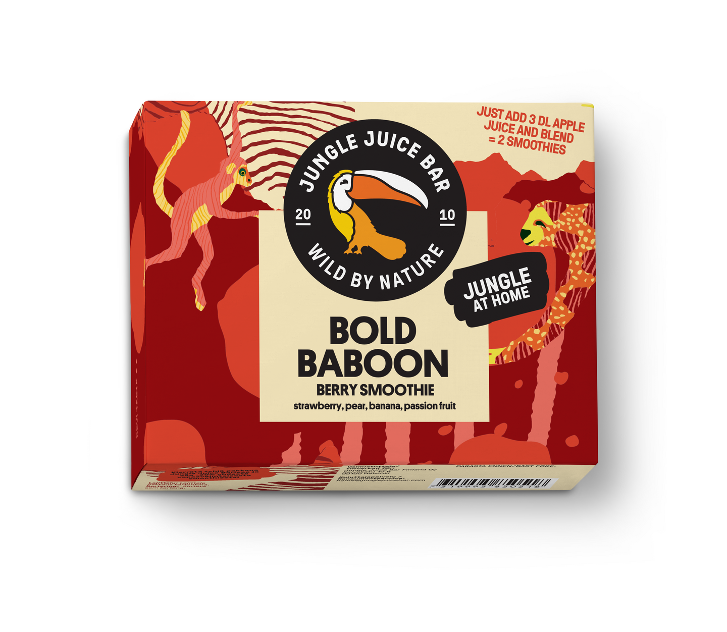 Jungle At Home smoothie mix -tuotteissa yhdistyy kaikki se, mihin me Jungle Juice Barilla uskomme: loistava maku, terveellisyys ja helppous. Haluamme tuoda smoothiebaarin tunnelmaa kotikeittiöihin napin painalluksella, ja siksi valmistusohje onkin "lisää vain mehu ja blendaa". Smoothie mixit tulevat kolmessa herkullisessa maussa: vihersmoothie Smooth Mamba, trooppinen Mighty Tucan sekä marjainen Berry Baboon. Kaikki sisältävät vain 100 % hedelmää, ilman lisäaineita.