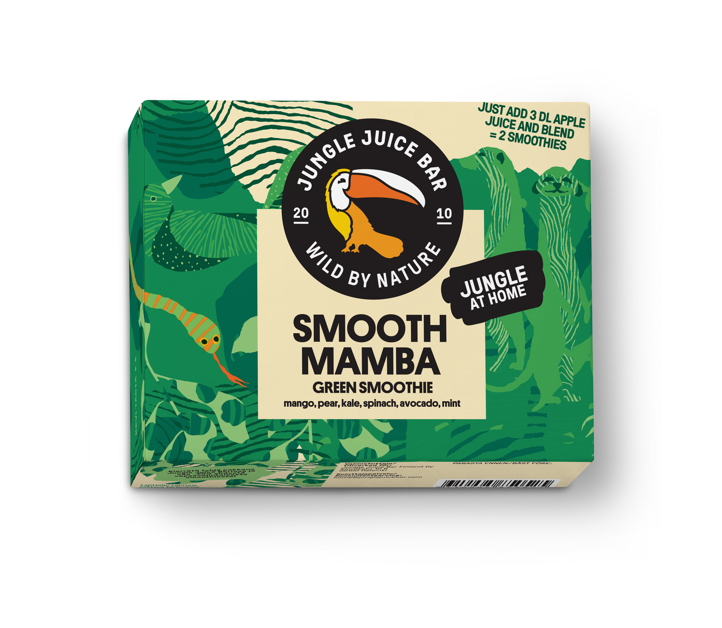 Jungle At Home smoothie mix -tuotteissa yhdistyy kaikki se, mihin me Jungle Juice Barilla uskomme: loistava maku, terveellisyys ja helppous. Haluamme tuoda smoothiebaarin tunnelmaa kotikeittiöihin napin painalluksella, ja siksi valmistusohje onkin "lisää vain mehu ja blendaa". Smoothie mixit tulevat kolmessa herkullisessa maussa: vihersmoothie Smooth Mamba, trooppinen Mighty Tucan sekä marjainen Berry Baboon. Kaikki sisältävät vain 100 % hedelmää, ilman lisäaineita.