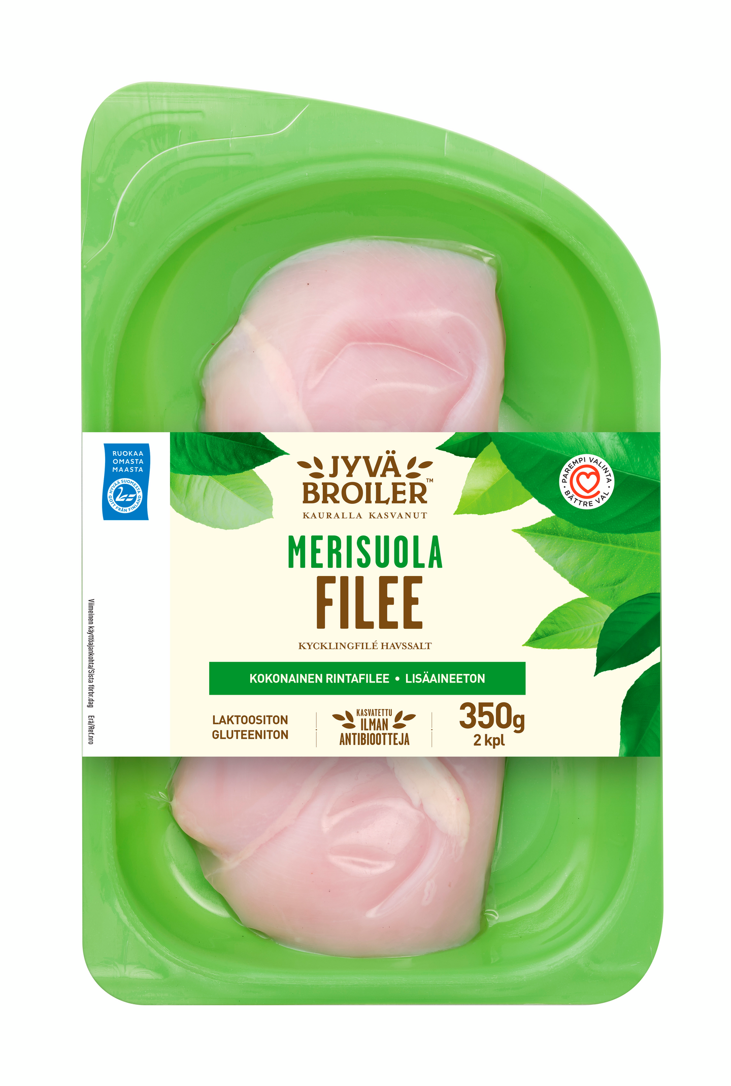 Merisuolattu Jyväbroiler kokonainen filee sopii todella moneen kanaruokaan, aina herkullisista ja täyteläisistä kastikkeista erilaisiin eksoottisiin ruokiin. Kypsennyksen jälkeen viilennettynä sopii myös mainiosti salaatin joukkoon. Miedosti suolatuista fileestä saat juuri sen makuisia kuin haluat, joko pintamaustamalla tai marinoimalla. Antibioottivapaa-merkintä pakkauksessa kertoo, että eläimet eivät ole tarvinneet ainuttakaan antibioottikuuria elämänsä aikana.