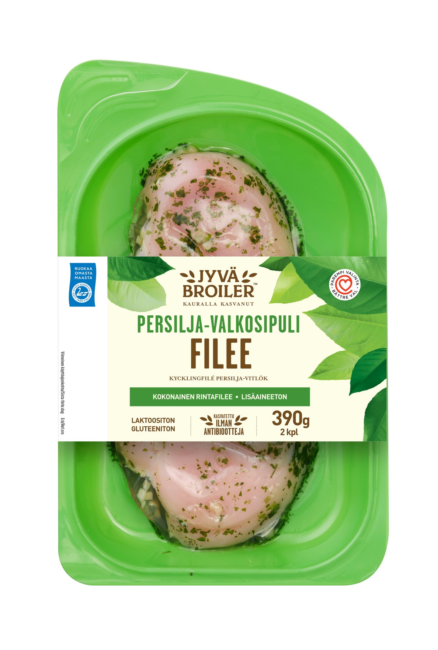 Jyväbroiler persilja-valkosipuli -maustettu kokonainen filee sopii todella moneen kanaruokaan. Aina herkullisista ja täyteläisistä kastikkeista erilaisiin eksoottisiin ruokiin. Kypsennyksen jälkeen viilennettynä sopii myös mainiosti salaatin joukkoon. Antibioottivapaa-merkintä pakkauksessa kertoo, että eläimet eivät ole tarvinneet ainuttakaan antibioottikuuria elämänsä aikana.