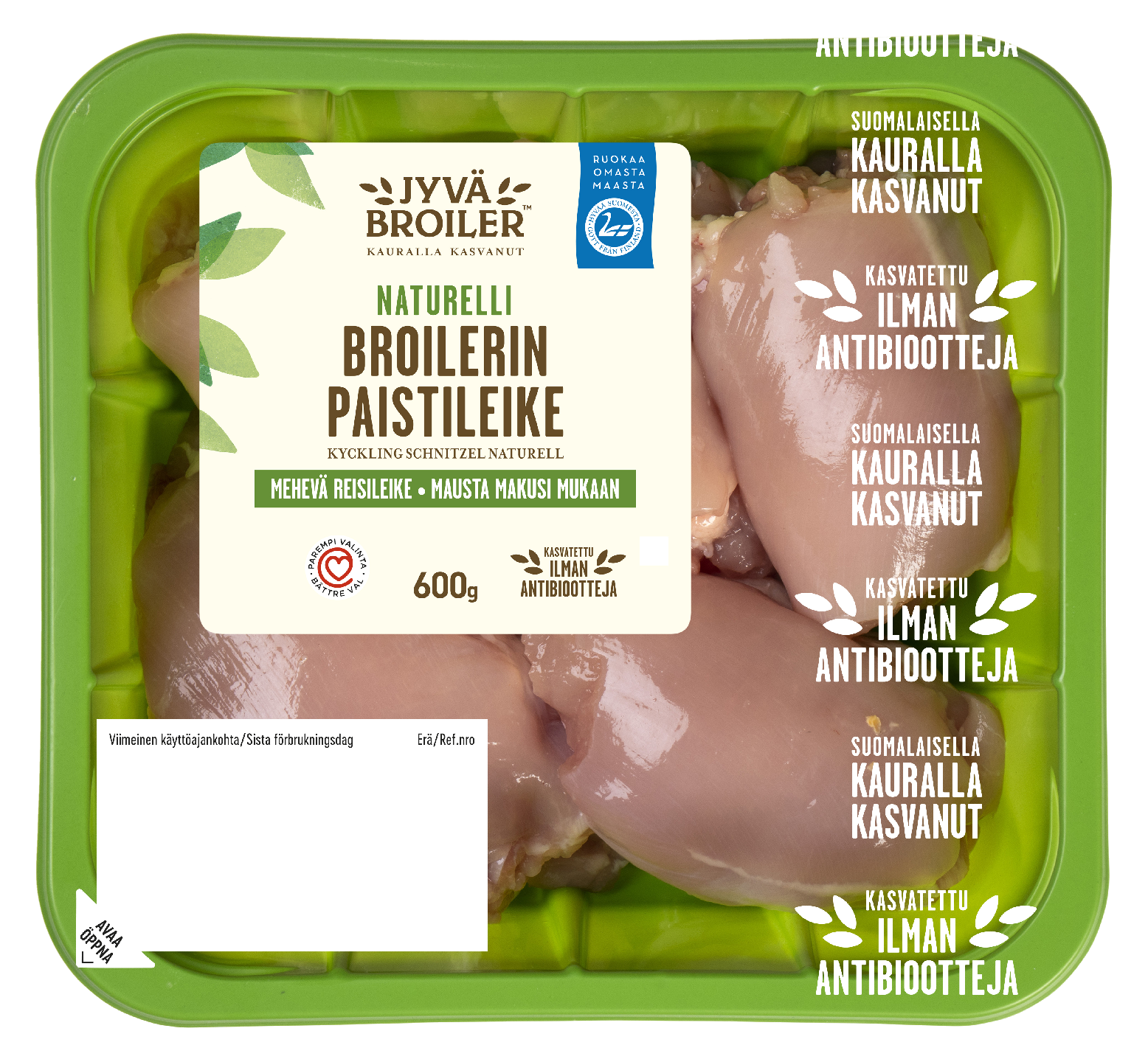 Jyväbroiler maustamaton kanan paistileike on erinomainen raaka-aine moneen eri ruokaan. Paistileikkeen voi kypsentää helposti pannulla, uunissa tai grillissä. Aina herkullisista ja täyteläisistä kastikkeista erilaisiin eksoottisiin ruokiin, kuten fajitaksiin tai tortilloihin. Kypsennyksen jälkeen viilennettynä sopii myös mainiosti salaatin joukkoon. Ota paistileikkeet huoneenlämpöön ½ tuntia ennen kypsentämistä. Grillaa tai paista kuumalla pannulla tilkassa öljyä yhteensä n. 10 min välillä kääntäen, kunnes sisälämpötila on 75°C. Antibioottivapaa-merkintä pakkauksessa kertoo, että eläimet eivät ole tarvinneet ainuttakaan antibioottikuuria elämänsä aikana.