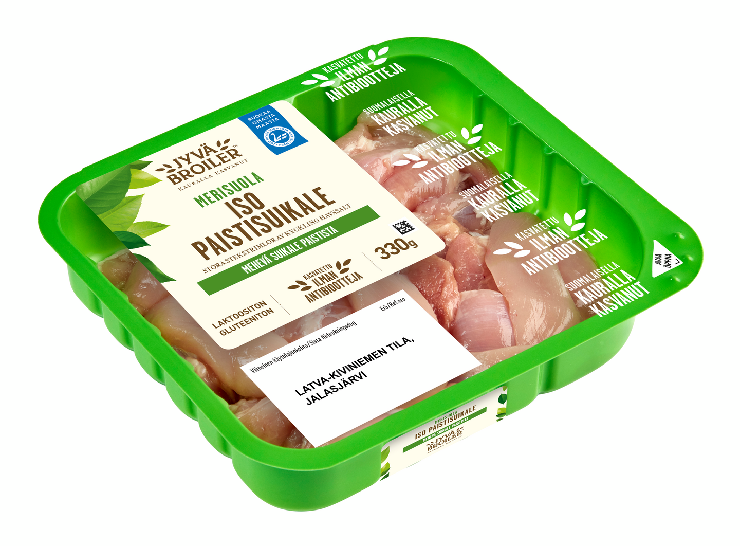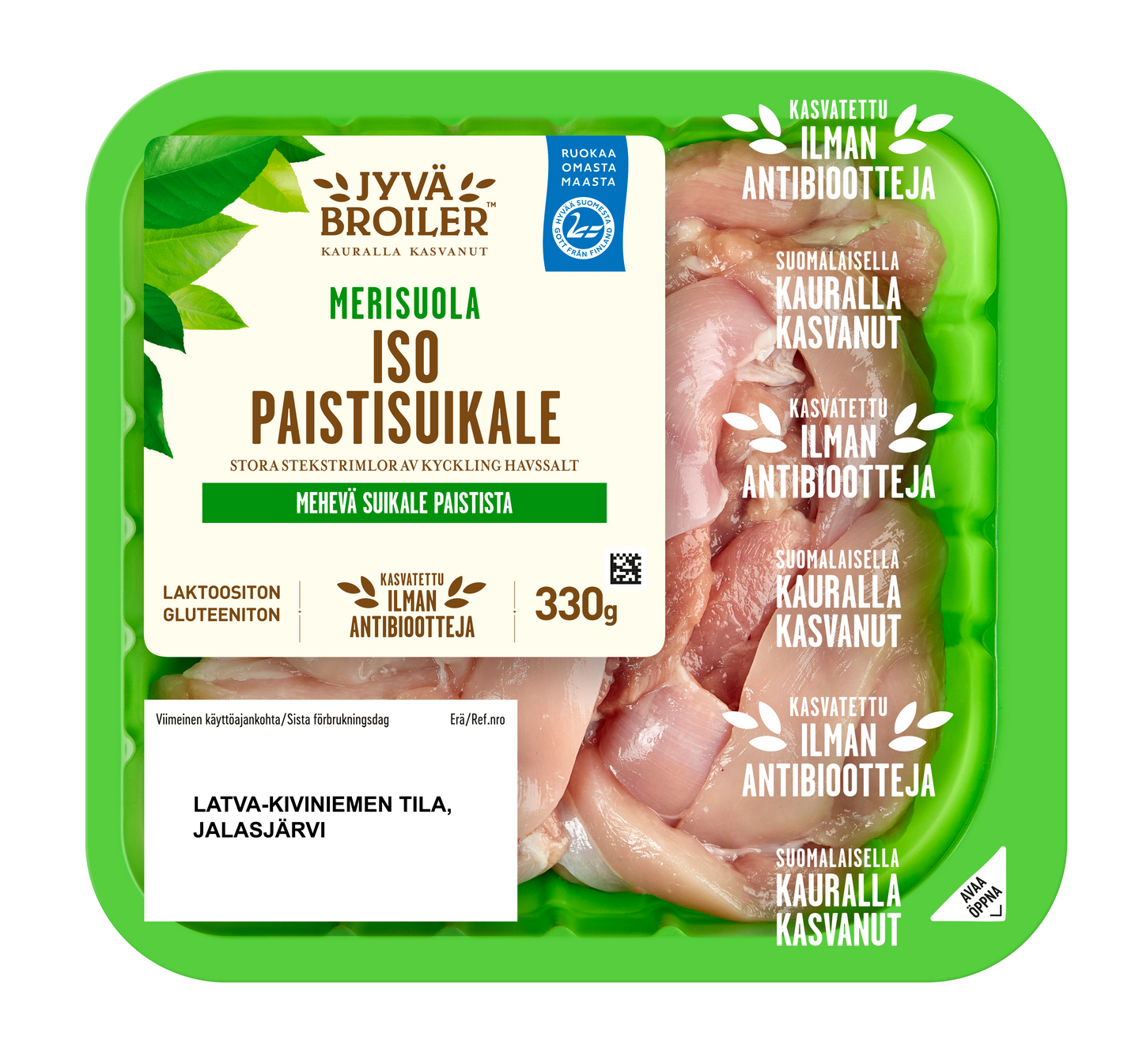 Jyväbroiler Broilerin Iso Paistisuikale Merisuola on mehevä, kanan paistista leikattu suikale. Mausta miedosti suolattu Merisuola oman makusi mukaan. Ota paistisuikaleet huoneenlämpöön ½ tuntia ennen kypsentämistä. Ruskista kuumalla pannulla tilkassa öljyä n. 2 min ja hauduta 6 - 8 min kypsäksi. Antibioottivapaa-merkintä pakkauksessa kertoo, että eläimet eivät ole tarvinneet ainuttakaan antibioottikuuria elämänsä aikana.