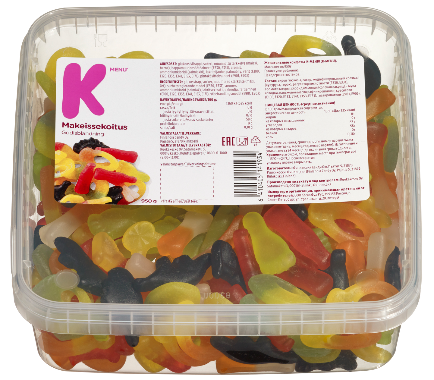 K-Menu makeissekoitus on runsas sekoitus sitkeitä hedelmä- ja lakritsimakeisia. Isosta ja tukevasta rasiapakkauksesta riittää hyvin herkuteltavaa isommallekin joukolle esimerkiksi lastenkutsuille tai viikonlopun leffailtaan. K-Menu makeissekoitus valmistetaan Suomessa Riihikoskella.