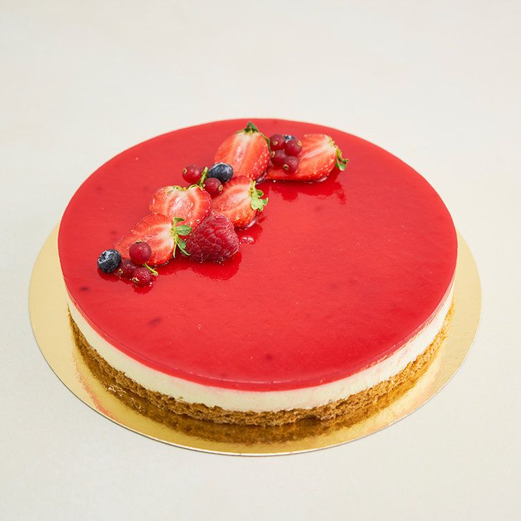 ENNAKKOTILATTAVA KAKKU Tilattava vähintään 3 arkipäivää ennen toimitusta. Kirjoitathan tilauksen lisätietoihin tilattavan kakun koon. Rapealla murupohjalla tuorejuustomousse, pinnalla mansikka-vadelma-punaherukkahyytelö. Koristeltu tuoreilla marjoilla. Saatavissa koot: 5hlö 28,50€ 10 hlö 45,00€